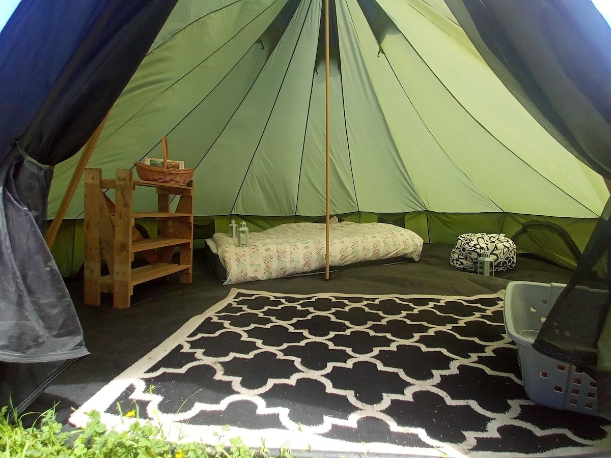 Venez vivre l'expérience unique en pleine Nature! Confortablement installés dans la tente-tipi vous serez au plus proche de la Nature. Le son de la riviere, le chant des oiseaux, les dernières lumieres du soleil... Ici pas d'électricité, ni d'eau courante! Un moment déconnecté pour se ressourcer. Un espace approprié ainsi que quelques bûches vous permettront d'allumer un feu pour une soirée sous les étoiles ! Pas de cuisine. Douche chaude exterieure avec une douchette à pompe manuelle.