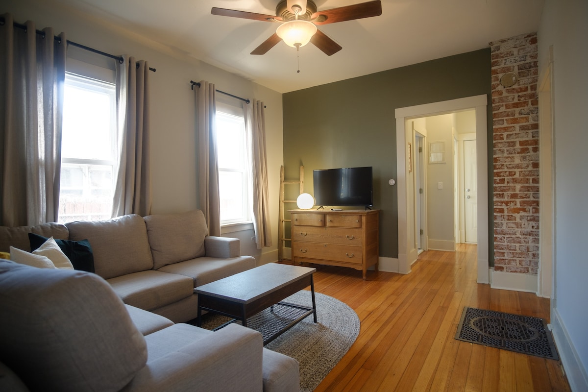 Upper floor apartment in a tree lined historic neighborhood. Walking distance to our vibrant downtown and several parks. A short drive to airport, IWCC, sports fields, downtown Omaha. 10 minutes to CHI and the NCAA Men’s Basketball Championships. Includes bedroom, living room, kitchen, bathroom and a seasonal sun porch. Use of outdoor spaces such as front porch and back patio shared with main floor guests. It is a historic home so will have your usual quirks that come with an older home.