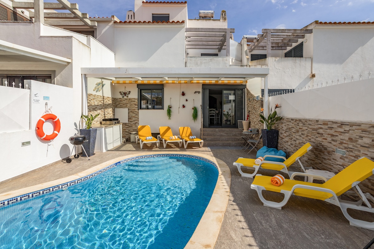 This stylish, centrally - located and recently renovated townhouse with pool is only a short walk to the beach, shops, restaurants, vibrant Quarteira and lively Vilamoura Marina. Enjoy a modern open-plan kitchen, two comfortable bedrooms, each with its own en-suite bathroom, kids' play area, private swimming pool, a welcoming patio, outdoor dining area, office space and an electric car charger for added convenience.