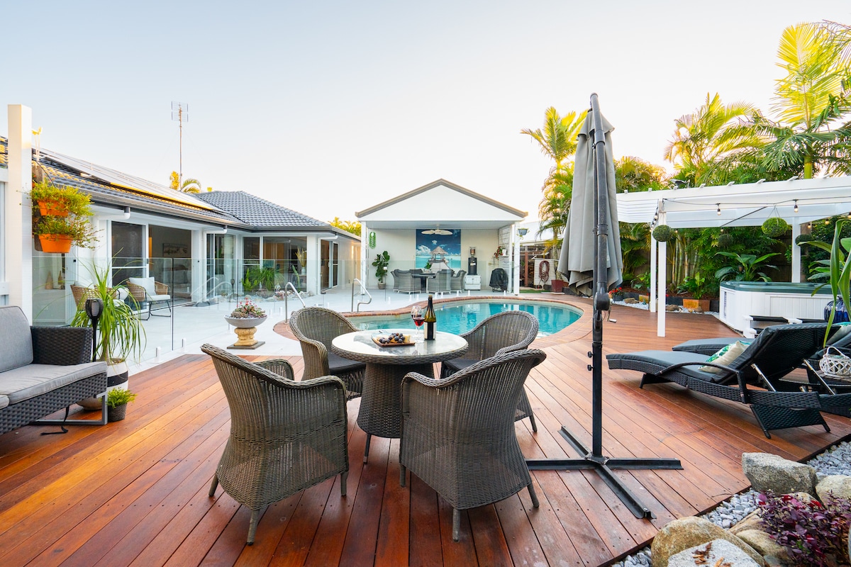 Relax & unwind in tropical rainforest. Lifestyle-inspired architecture compliments the ocean views & breezes. Immerse yourself in a truly relaxing atmosphere. 3 levels of luxury include a private heated pool, 2 decks & games room. Enjoy the privacy, listen to the ocean & birdlife. Watch whales frolic during season. Easy walking distance to Coolum’s secluded First Bay, popular Main Beach, alfresco strip & restaurants. Note - DEFINATELY NOT a party house. YouTube video search - 25 Fauna Terrace