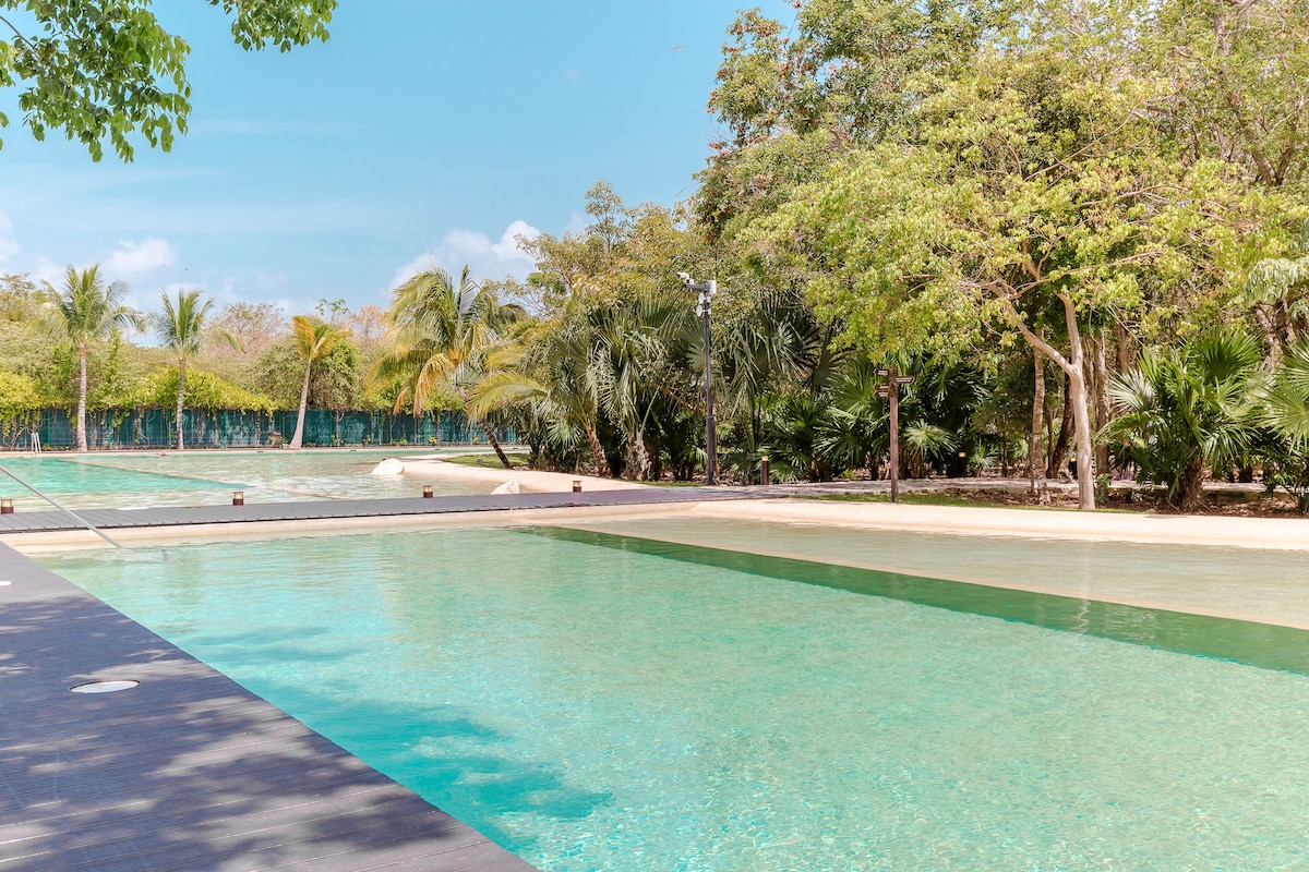 Fully equipped condo with relaxing mangrove view and feel good amenities in prime Playa del Carmen (PDC) location! Enjoy the rooftop pool, hot tubs and gym, all with an amazing ocean view from the building's rooftop. Just a few minutes walk from the white sandy beach and the 5th Avenue (Quinta Avenida) where PDC's dinning, shopping, and nightlife is focused. PDC's famous Mamitas Beach will be your closest access to the sea (few mins walking).