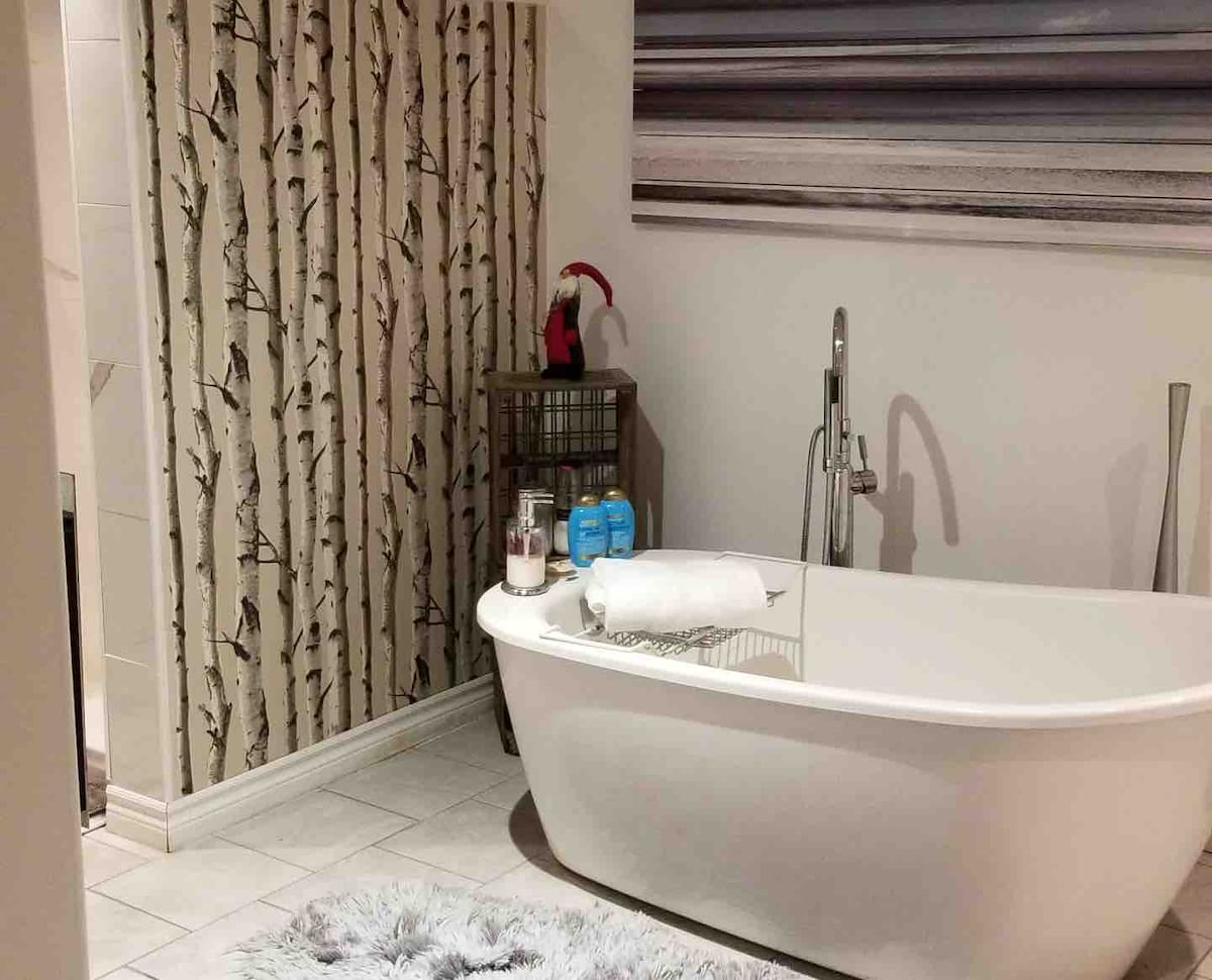 A nice brightly furnished basement apartment only 2 min. from the 401. Beautiful backyard on the Moira River. Minutes from the Quinte Mall, Liquor store, Walmart, and restaurants. 5 min. to downtown The suite includes a queen bed, 3 piece bathroom, diningtable for 2, fridge/freezer, microwave, keurig coffee maker, coffee, tea kettle, convection oven, and toaster. Iron 5G speed network Hand painted wooden floors and fireplace. Original art pieces and handpainted paintings by my daughter.