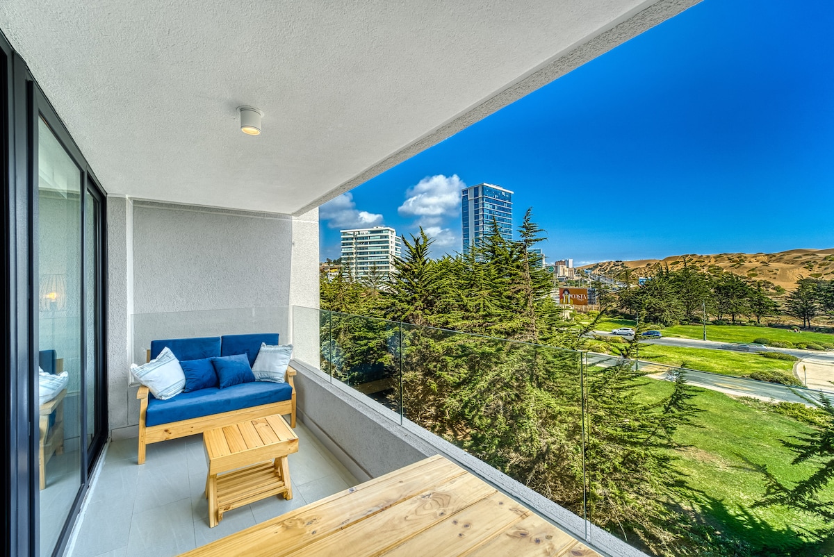 Relájate y disfruta de este confortable departamento con una impresionante vista del campo de dunas, Santuario de la Naturaleza en Concón. Al interior, el paisaje cautivará tu mirada en las distintas horas del día, fusionando con armonía un moderno paisaje urbano, dunas, cielo y mar; al salir, descubrirás las bondades de una ubicación privilegiada en Montemar. Ya sea que viajes solo o en pareja, este lugar te brindará una experiencia inolvidable.