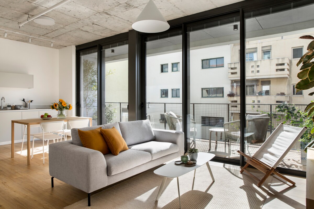 BEAUTIFUL MODERN flat in new group buildings. In Florentine 2 elevators, 1 Shabbat. The apartment is only for you. Efficient and silentfull Air Conditioning with very precise, 1 step degree more or less choice, commands panel. Clear, nice view on sky, and sea, SUPER KING SIZE bed (1,80m wide) very confortable. Pedestrian street, cafes, restaurants, stores, just down the building. Gym space in next building. TIP : Minimum renting is 6 days - 5 nights.