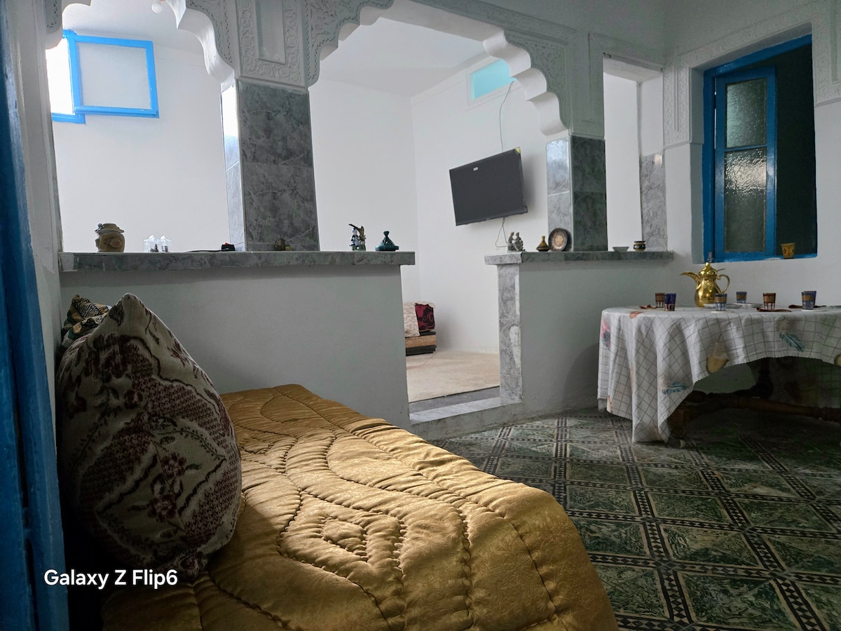 Typical house, situated in the heart of the Kasbah of the Oudayas, on 3 levels: - First level : a living room and dining room, a kitchen and a separated toilet, - Second level : 2 bedrooms for 4 people and a bathroom, - Third level: a big terrace with a magnificent view. The house is located 200m from the famous Maures Café and the Oudayas gardens and museum, 500m by foot from the beach and restaurants and 400m from the entrance to the Moroccan crafts Bazaar.