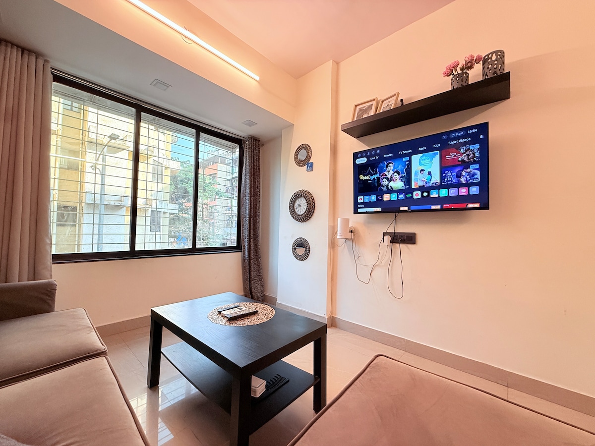 Madhuleela by Innjoyful: 600 sq ft., big size 1-bed accommodation. Here, we have 4 apartments in the same building. Your comfort zone with a fully equipped kitchen with amenities like a washing machine, microwave oven, and a gas connection in a modular kitchen. Enjoy exclusive privacy in this 1st-floor apartment—the only apt on the entire floor. Sensory Garden: 50m Juinagar Station (W): 350 m Sanpada Station 1.7 km Mindspace Juinagar: 2.6 km Vashi Station: 3 km DY Patil Stadium: 3.9 km