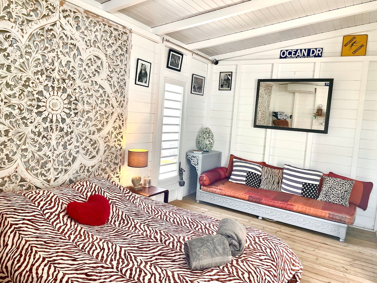 Jolie petite maison au cœur d'un jardin tropical équipée d'une chambre avec literie de qualité hôtellerie. La terrasse couverte vous permettra de profiter des chaudes soirées, la cuisine est équipée du nécessaire à votre confort la salle de bain avec douche à l'italienne vous permettra un confort idéal le logement est à proximité du centre de Saint-François et de la plage. Alex cuisinier de profession vous propose une table d'hôte le premier petit-déjeuner vous sera offert par vos hôtes.