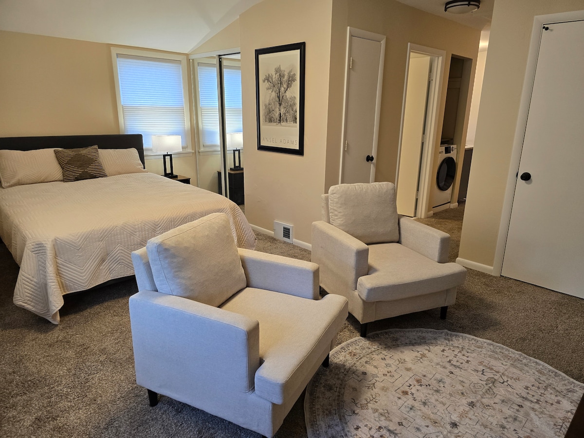 Enter through a private entrance to this basement studio apartment. Newly constructed in 2018, the space is well lit, insulated, and in a quiet neighborhood. Enjoy a full bathroom with laundry, and a kitchenette: 4.5 cu.ft. refrigerator, microwave, extra large toaster oven, hot plate, crock pot, pots, pans, dishes, keurig coffee machine, and full kitchen sink. 1 queen bed accommodates up to two guests. Guests must have at least 3 positive stay reviews to book our space.