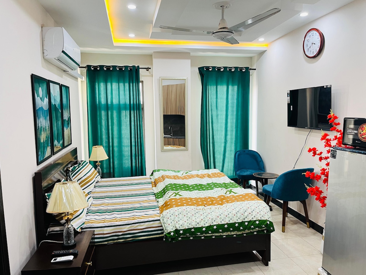 Modern, Cozy and Luxurious stay in Bahria Town Islamabad with Self-Check-in, Free Parking, Fast WiFi & Chromecast enabled TV. Enjoy a King Bed, Private Balcony with Views and Seating, Kitchenette (Fridge/Freezer, Microwave and Electric Kettle), and stocked Bathroom. Breakfast and Room Service available upon request and charges. In-house café and restaurant available. Prime location near parks, malls & restaurants, just 12-15 mins drive from DHA2 and Giga Mall and under 1 hour from the airport.