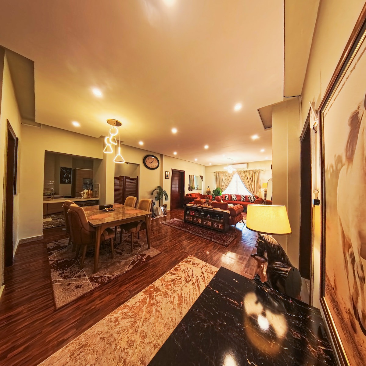 No other rental beats this lavish, Centrally located, secure & immersed in serenity beautifully designed & tastefully furnished independent 3 bedrooms residence with private entrance & parking for families, business travelers & anyone looking for a Royal luxury Home @ Central Location. Soak up the modern & vintage charm of this Royal brand new villa. Extraordinarily lavish designer furnishing, spacious rooms, greenery, spectacular views & workplace. Large beautiful garden to host gatherings.
