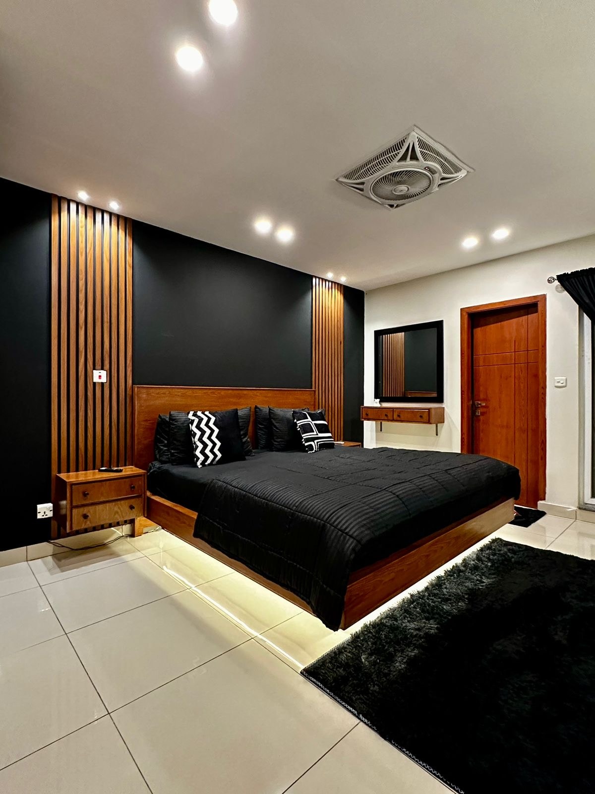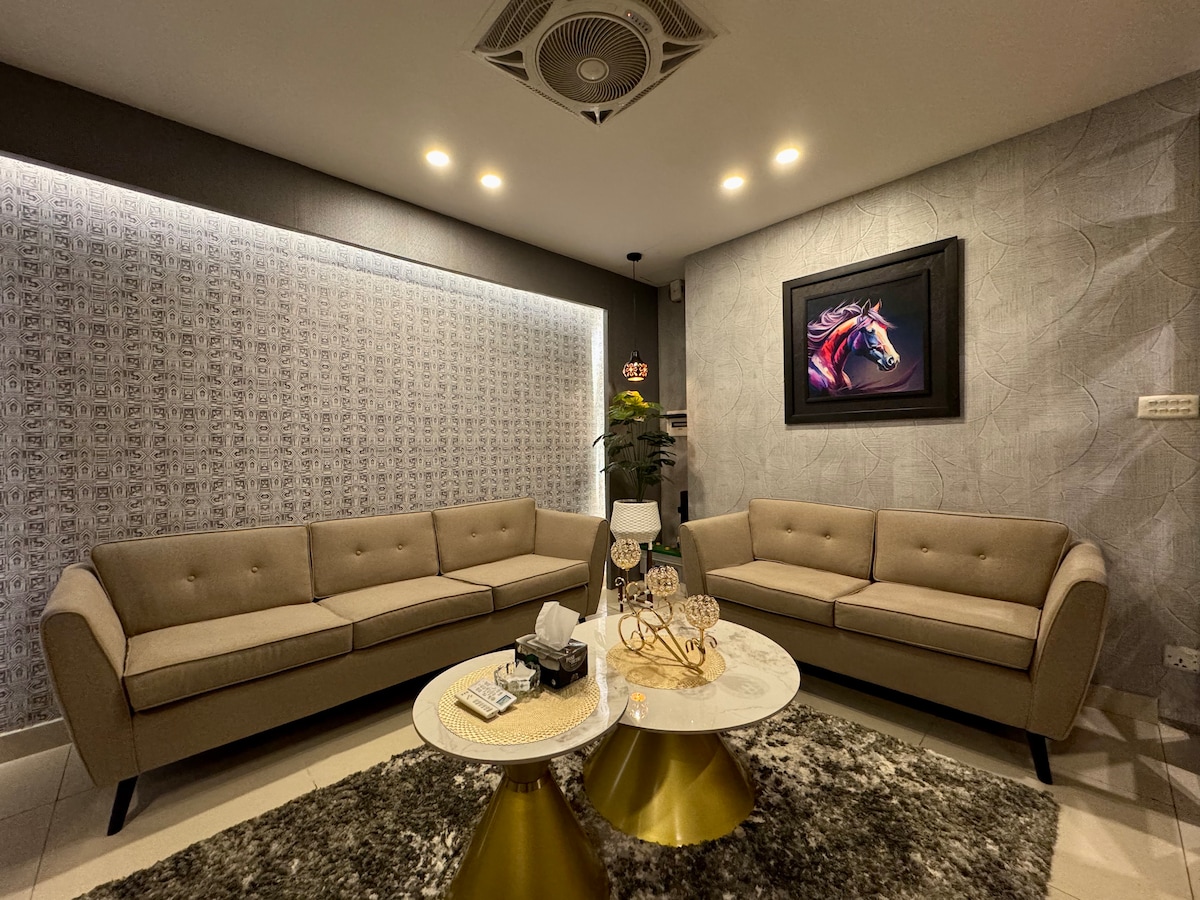 Designed with great care by an interior designer, The Black H comes with a spacious lounge and bedroom, huge 60" LED TV, 10-seater sofa, fully equipped kitchen and a distinctive decoration piece – an ibex's skull (Ethically sourced) – adding a rustic charm to the space. It is located in Bahria Heights 1, one of the most premium living standard maintained by Bahria Town. All major restaurants and cafes are close-by and building has 24/7 security