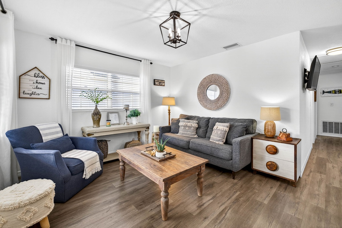 Centrally located, safe & desirable neighborhood by Hillsborough River. Corner lot, Free covered parking, easy self checkin, Bohemian style decor & vibe, stocked kitchen, SMART TVs, Laundry Rm, Fireplace. Outside Fire Pit, Picnic Table w/BBQ Grill, Hammock. Close to Lowry Park Zoo, Downtown/Convention Center, Riverwalk, Armature Works, Ybor City, Busch Gardens, Hyde Pk, Midtown, Airport, Beaches & More. Perfect for Vacation, Romantic Getaways, Family Visits, Concerts, Hockey/Football, & Work.