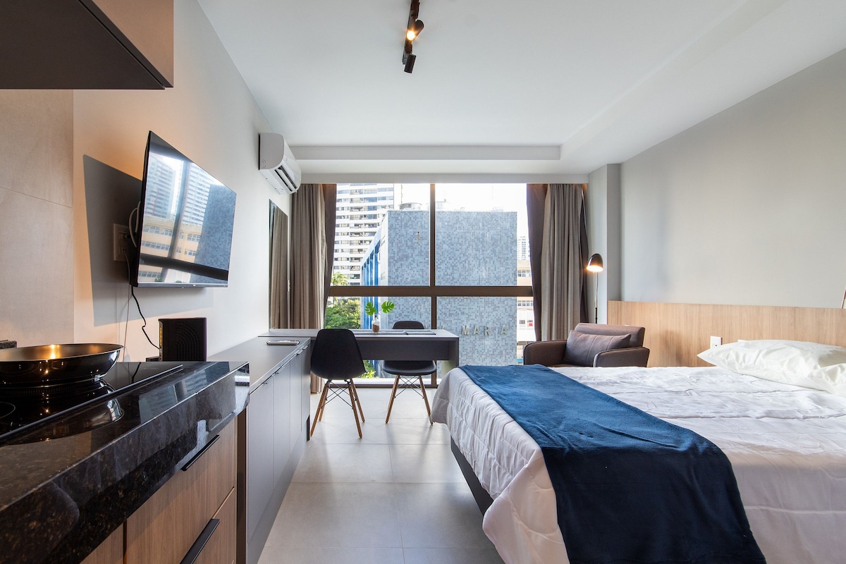 Este lugar único tem um estilo próprio. Perfeito para quem vai trabalhar ou curtir uns dias em Recife. Ótima localização, perto da praia, dos principais Shoppings, restaurantes, padarias, cafés, etc. Nosso apartamento conta com uma confortável cama queen e cama auxiliar. Roupa de cama premium. TV de 50’. Internet. Cozinha bem equipada. Uma mesa confortável para refeições ou para trabalhar. Edifício com estacionamento, lavanderia, coworking, espaço gourmet, piscina, hidromassagem, academia.
