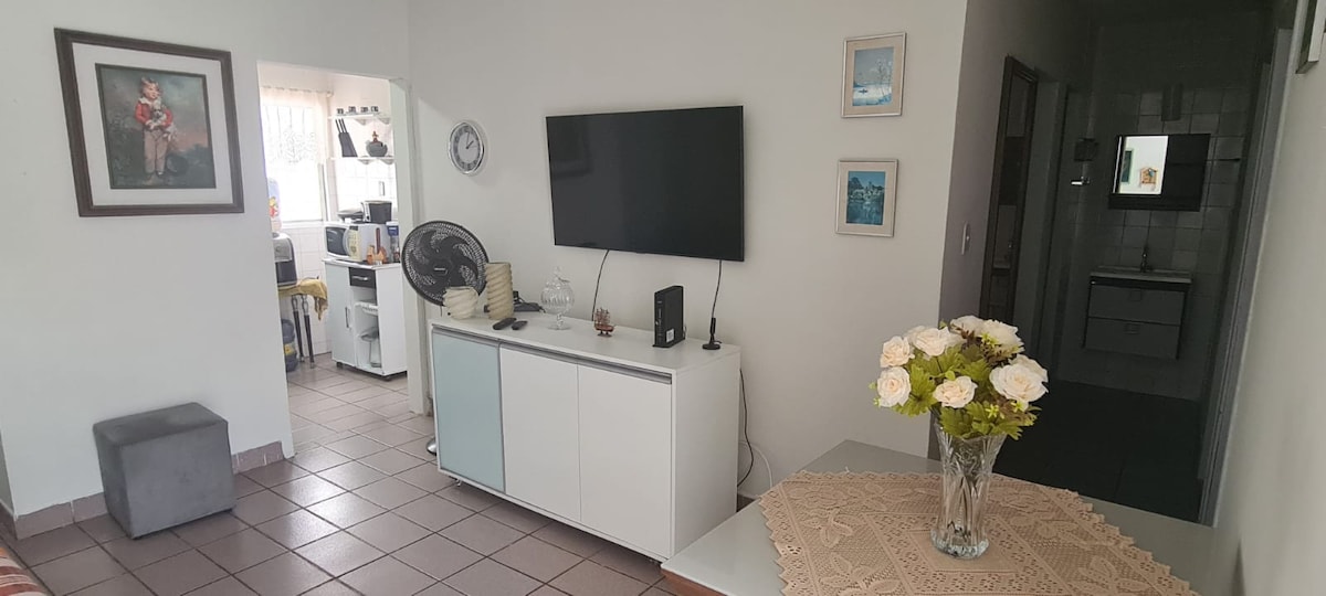 A acomodação é para até 03 pessoas, tendo uma cama de casal no quarto com ar condicionado e 01 sofá cama na sala, com ventilador o apartamento tem mobília completa, inclusive para fazer refeições. Fica próximo a praia, restaurantes, supermercados, farmácias, padarias e shopping. Não aceita visitas. Não aceita pets.