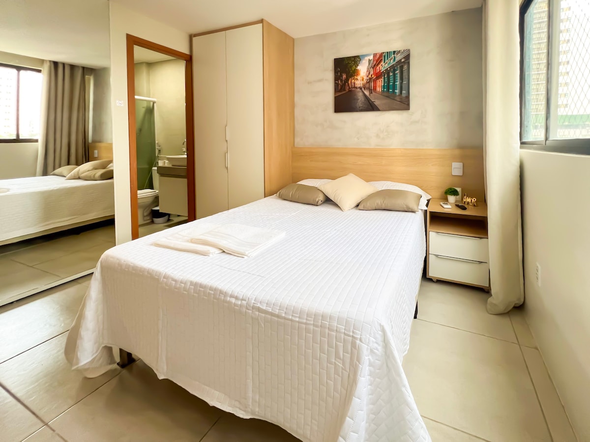O Flat esta em uma excelente localização de Boa Viagem, quarto e sala, com cama de casal e um sofá cama, cooktop 2 bocas e microondas, 2 ar-cond (Split), 2 Smart Tv, wifi, armário, espelho, mesa de trabalho, mesa de jantar, utensílios e eletrônicos de cozinha, peças de cama e banho. Mobiliado, vaga de garagem(Confirmar no ato da reserva), moveis planejados, salão fitness. Próximo ao Shopping Recife (10 min a pé), a praia (10 min a pé) e em frente ao Big Bom preço (Supermercado com utilitários)