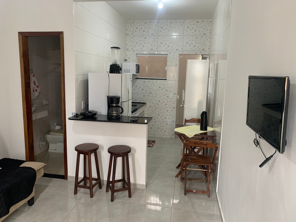 Flat com cozinha e banheiro privativos (só voces usam) com internet, TV smart 32'' , roupa de cama inclusa, localizado a duas quadras da praia, com ventilador de teto, Cooler que pode ser usado levando suas bebidas para praia, possui uma pequena varanda e rede de descanso, equipado com ferro elétrico, cafeteira e secador de cabelo Para acessar o Flat necessário subir uma suave alameda de uns 20 metros..