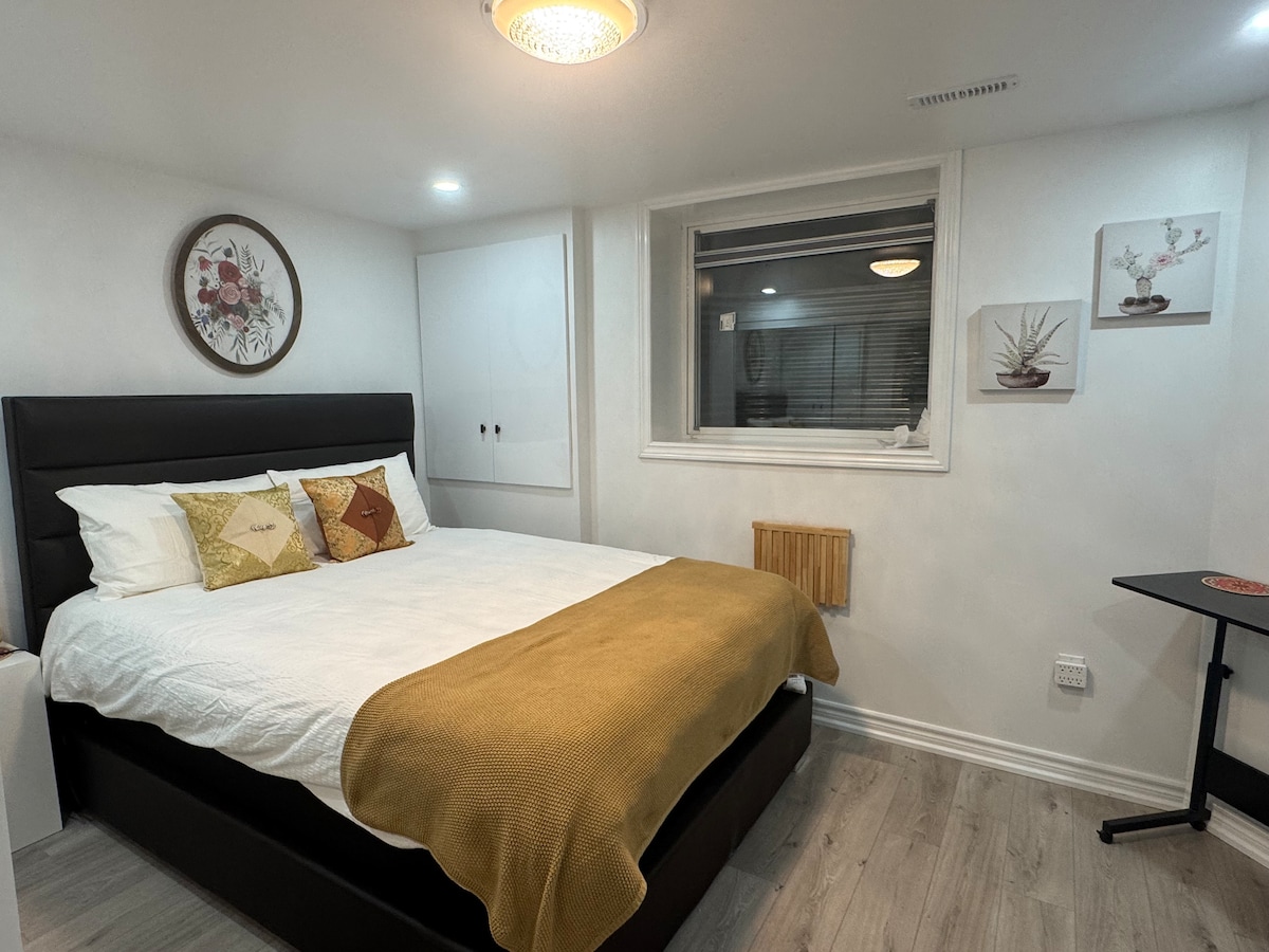 Escape to our modern basement suite in Ajax, perfectly situated just 10 minutes' drive from Ajax Waterfront and close to the 401. This newly renovated space combines style, comfort, and convenience for an unforgettable stay. Enjoy a private entrance leading to a large bedroom with a plush queen bed and a stylish bathroom stocked with essentials. Relax in the contemporary living area, featuring a comfy sofa and smart TV with full kitchen, Wi-Fi, dedicated workspace and laundry facilities in unit.