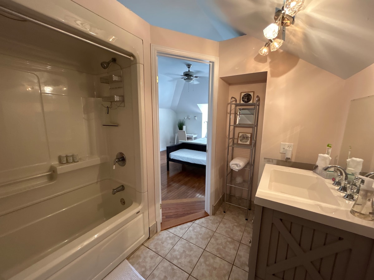 Rose Grove is an elegant & ultra-feminine room, perfect for the girly girl in you. This charming room features a queen bed, delicate rose-themed accents & a sparkling chandelier that adds a touch of glamour. Soft, romantic decor creates a cozy and inviting atmosphere, making it an ideal space for women. Rose Grove shares a full bathroom with Lavender Fields, a great option for friends or family traveling together. The bathroom is just steps away, ensuring convenience while maintaining privacy.