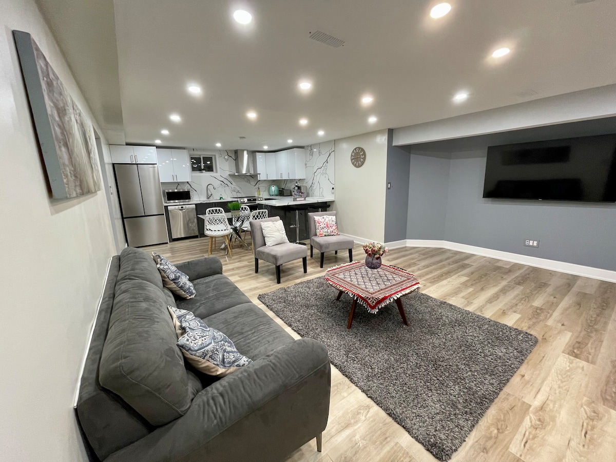 Fully renovated, modern, Bright, luxurious, and spacious ( over 1800 sq/ft) 2-bedroom, 2-bathroom high ceiling above ground apartment, separate entrance, and Patio for your next cozy home away from home! 5-star rated and top 5% of homes in AirBnB! As central as it gets in the GTA. You'll be close to Pearson Airport, Highway 401/404/407, shopping malls, grocery stores, and an array of trendy restaurants, movie theaters, parks, and bicycle/ hiking trails all around Book With Confidence!