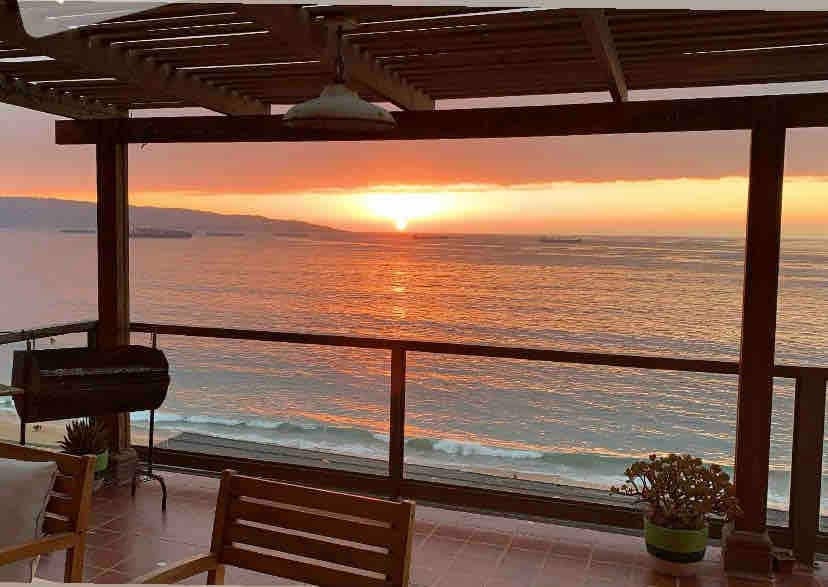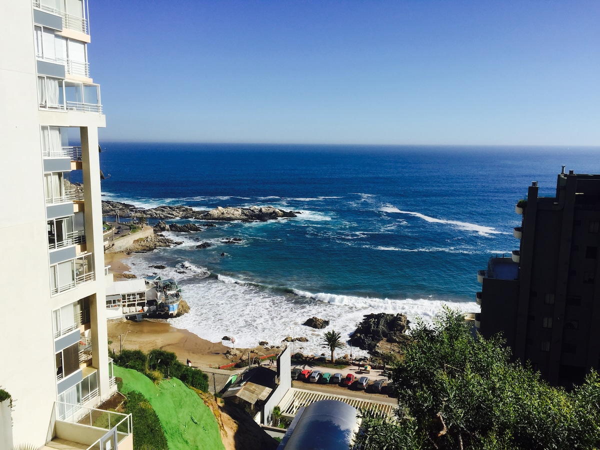 Right ON the beach in Reñaca, our place has stunning views over the beach, ocean and Valparaiso bay! It is uniquely located right next to restaurants, bars, coffee shops, a gym, shops as well as lots of family friendly activities both on and off the beach. We are situated on the 4th floor and our large private ocean-facing terrace is incredible! Come and enjoy! Rental includes sheets and towels, access to pool, garage parking and washer in the unit and NEW HIGH SPEED INTERNET (fiber optic)