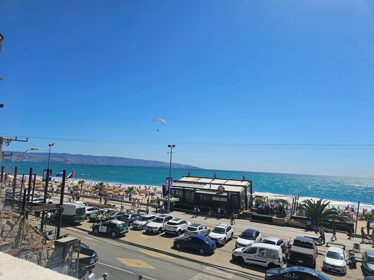 Lindo departamento con preciosa decoración. Totalmente equipado para 4 personas . Primerísima línea, vista libre, espectacular e inmejorable a Valparaíso, se encuentra a 15 min caminando de la playa Cochoa (hay que bajar una escalera). Está a pasos de Supermercado Lider y Jumbo.Incluye 1 Estacionamiento privado subterráneo. Excelente conectividad y transporte público a una cuadra. **NO ESTÁ EN EL SOCAVÓN ** DEPTO SOLO PUBLICADO EN AIRBNB No redes sociales ni otras plataformas.