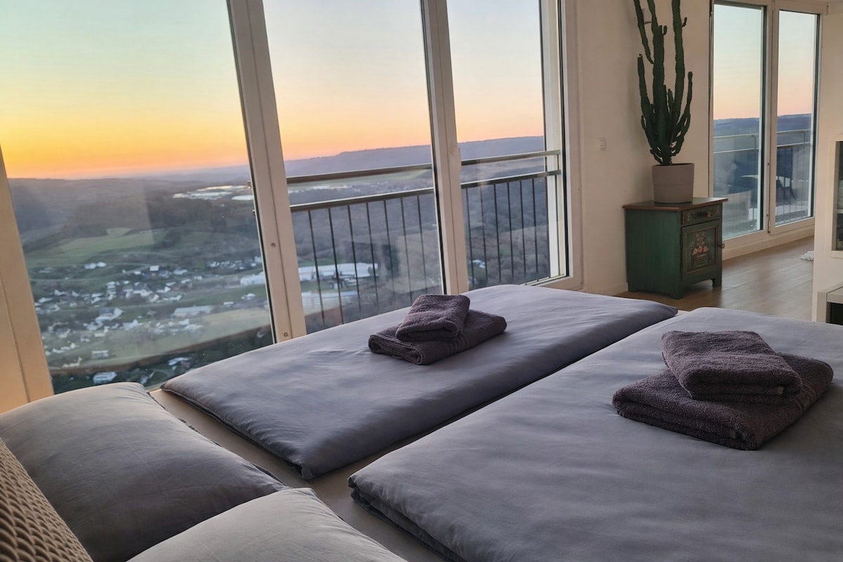 The apartment has a special atmosphere ... a mixture of old and new and the rooms merge into each other. You first enter the dining area and look through the bright living room with the wide view into the Eifel. Two steps down you´re entering the cozy living room with a big sofa an then you´ll find the sleeping area with double bed (160x200cm) and a stable bunk bed for children and adults. Tuesday to Sunday breakfast possible in our café/bistro. Sauna, Ebike hire
