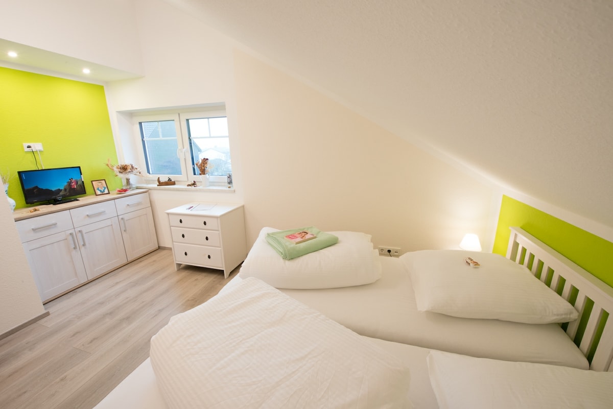 Cheerful colours and warm wood tones permeate this open and bright flat. When you wake up in the morning, the first rays of sunshine fall through the large windows and welcome the day. And when the weather is gloomy, just make yourself comfortable on the sofa next to the wood-burning stove. The sleeping area with a double bed and a bunk bed can be separated with large, old sliding doors. Tuesday to Sunday breakfast possible in our café/bistro. Sauna, Ebike hire