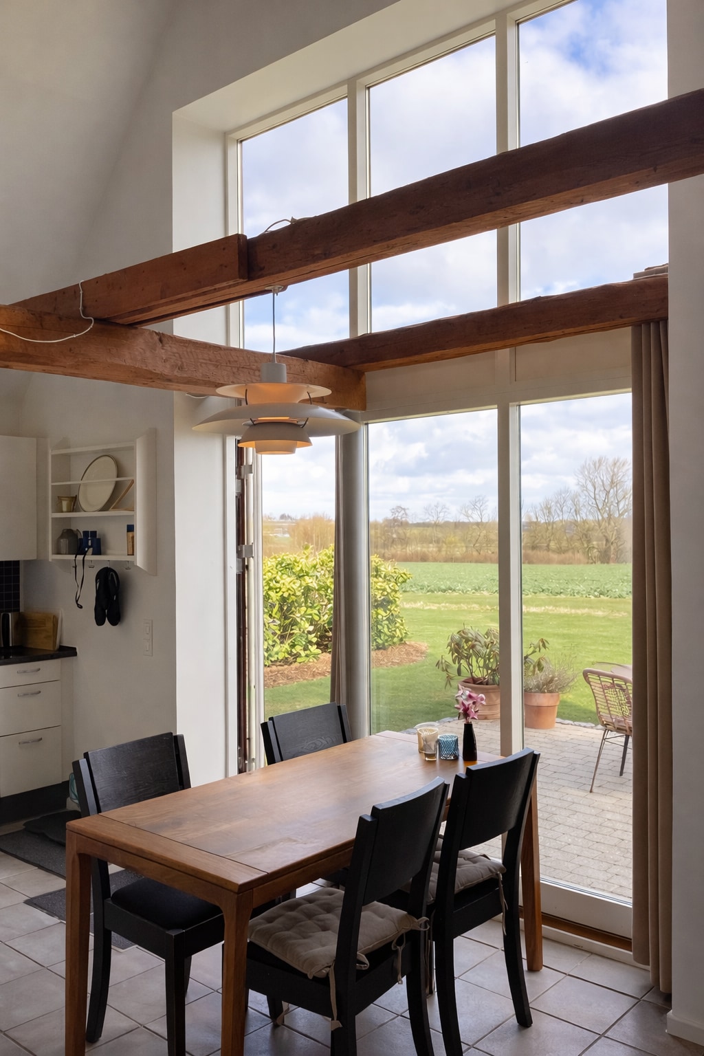 Nostalgisk ny feriebolig til 6 personer i den gamle staldbygning. Hele boligen er i stueetage og opført i gammel badehotelstil anno 1930. Vi bor selv i stuehuset på ejendommen, for enden af en stille grusvej, med dejlig ro og landlige omgivelser. Vi er en familie med 2 børn. Vi har heste, dværggeder, katte, hunde. Vi ønsker at vores gæster skal opleve en afslappet atmosfære af landidyl, nostalgi og komfort. Ferieboligen har egen lille have og en hyggelig træterrasse med en have-pavillon.