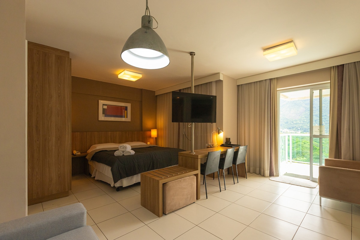 Flat moderno e aconchegante, reunindo o conforto de um hotel com a liberdade de um lar. Ideal tanto para quem viaja a lazer quanto a trabalho, o espaço conta com uma suíte com cama queen, ar-condicionado, Wi-Fi, TV e frigobar. O condomínio oferece uma excelente infraestrutura: academia, piscina, sauna, jacuzzi e restaurante com preços acessíveis. A localização é privilegiada, a apenas 100 metros do RioCentro, garantindo praticidade e fácil acesso a diversas atrações na Barra da Tijuca.
