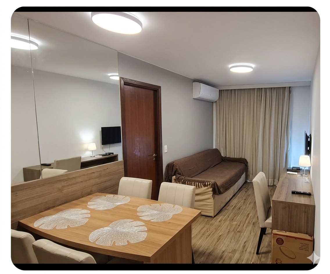 Flat com sala, quarto, cozinha, banheiro e varanda. Ar condicionado no apartamento todo (2 splits), 2 smartTV (sala 40) e cozinha com utensílios. Oferecemos roupa de cama e banho. O condomínio possui piscina, sauna, hidro e academia disponíveis ao hóspede sem necessidade de atestado. Recepção 24 hs, pode entrar a qualquer hora! Arrumação diária, wi fi e estacionamento incluídos. Prédio com acessibilidade, elevador, lavanderia, mini mercado, auditório e Restaurante com todas as refeições.