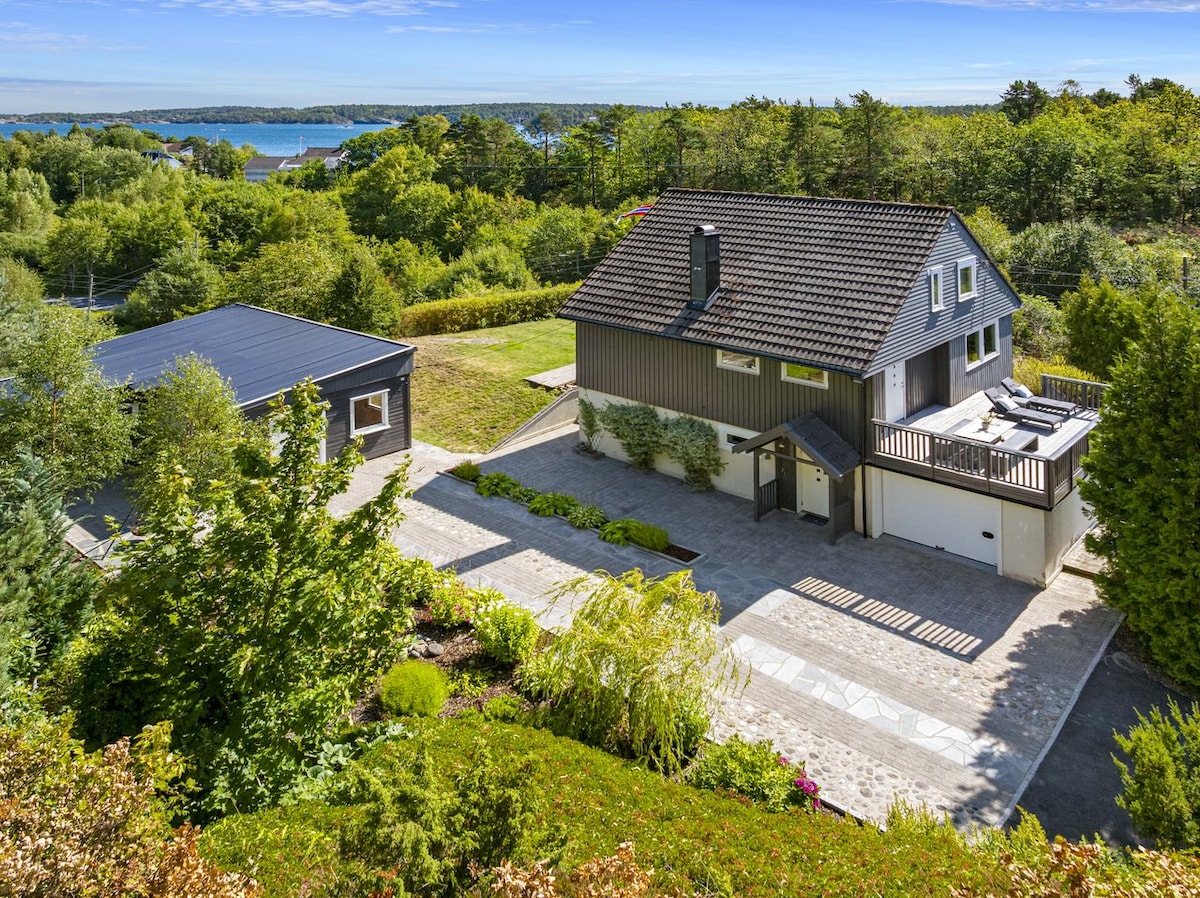 Flott og meget romslig (323 kvm) feriehus med panorama utsikt over innselingen til Risør! Beliggende nærme sentrum og sjø, samt meget kort vei til flott turterreng i Urheia. Huset har alle fasiliteter som hage med trampoline, badekar, isbitmaskin, kaffemaskin, to stuet, flotte uteplasser med utsikt og lader for elbil. Huset egner seg godt for to eller flere familier:-)