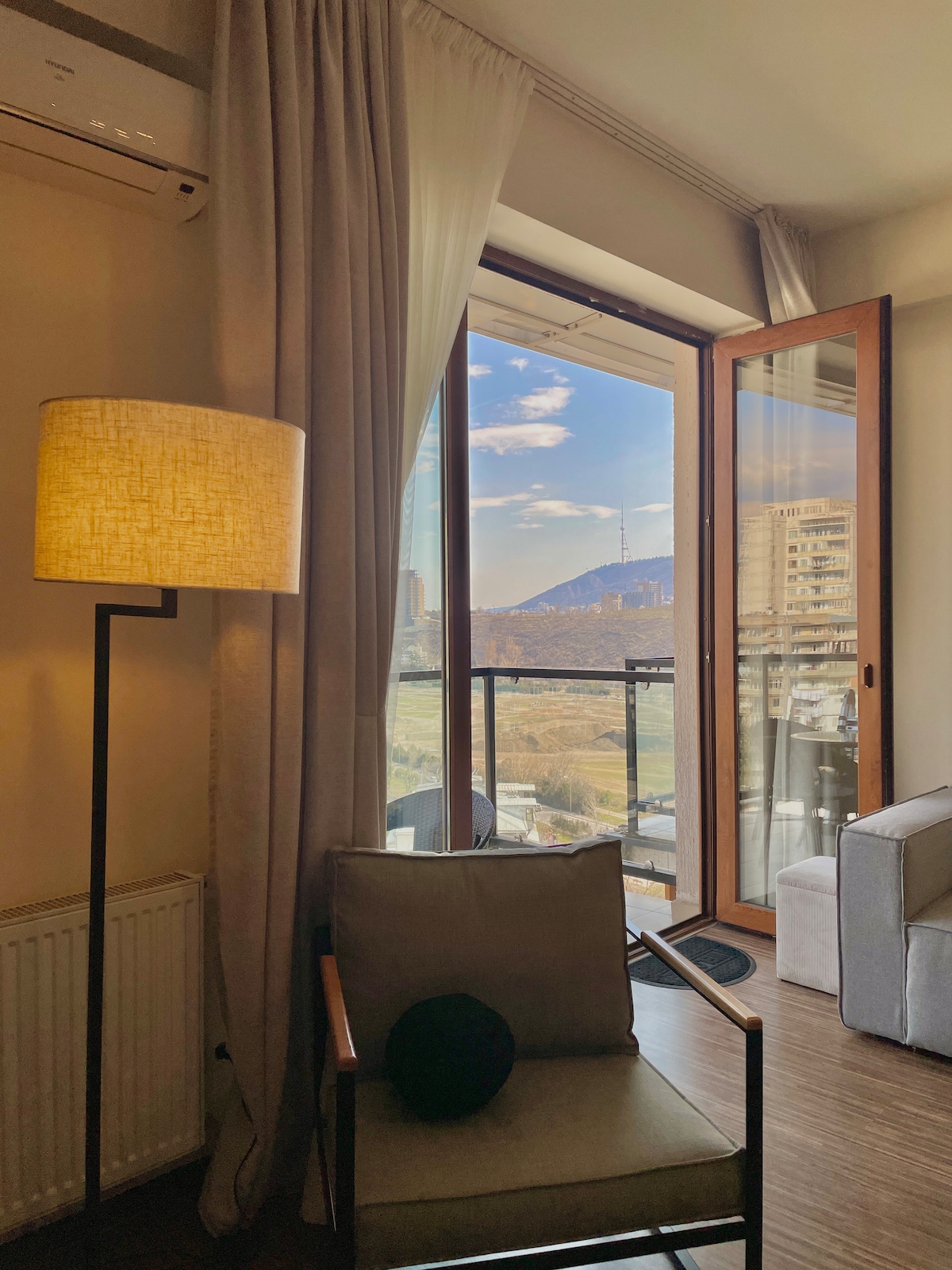 Step into modern comfort in the heart of Tbilisi, where city views and stylish design come together. This pristine space features a spacious bedroom, a sleek modern bathroom, and a private terrace with stunning views of the city — the perfect spot to enjoy your morning coffee or unwind in the evening. Perfect for solo travelers, couples, or business guests looking to experience Tbilisi in style and comfort. Enjoy the perfect blend of city life and luxury right at your doorstep!