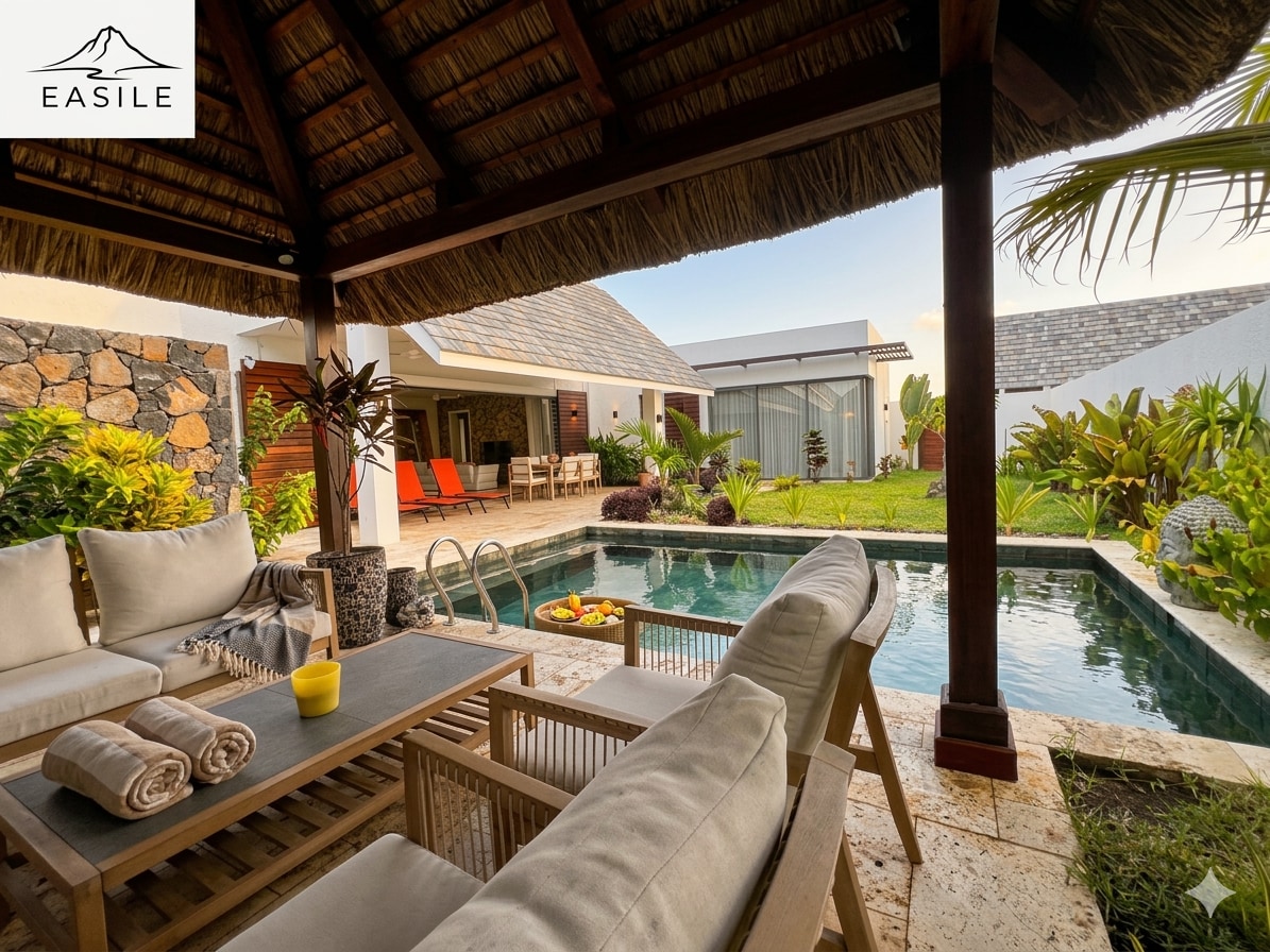 Villa EASILE à Grand Baie, Île Maurice. Villa moderne de 220m2 mêlant style mauricien et confort occidental. Suite parentale avec douche et baignoire extérieures dans la végétation tropicale. Deux chambres avec douche extérieure dressing et bureau. Grande pièce salon-cuisine ouverte sur terrasse, piscine chauffée et kiosque. Wifi fibre pour télétravail. Accueil personnalisé par Valery avec repas créole et possibilité de cours de cuisine locale. Séjour authentique et convivial au cœur de Maurice.