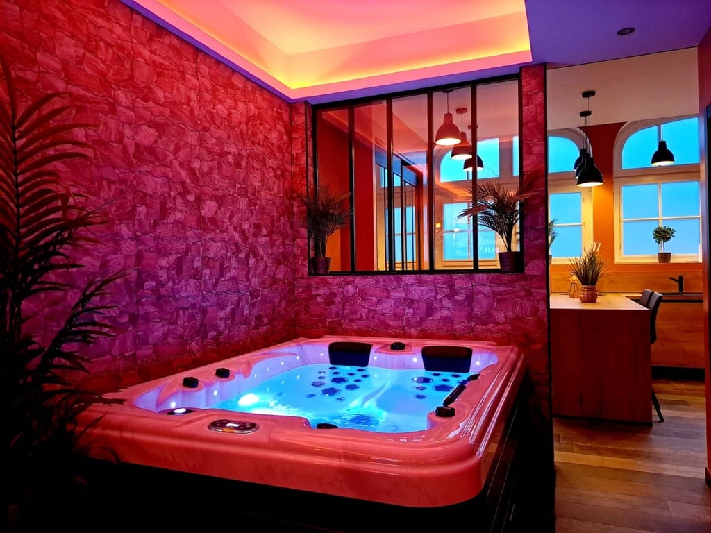 Envie d’une escapade en amoureux, ce logement d'environ 50 m² propose un espace détente avec spa et sauna décoré avec soin. Ce logement calme et élégant dispose d'un salon avec cuisine équipée ainsi qu'une chambre à coucher avec un lit Queen Size pour terminer la soirée et passer une excellente nuit. Enceinte, TV, WIFI sont à votre disposition. Vous choisissez l’ambiance souhaitée grâce à un éclairage doux et coloré. A disposition : Café, Thé, savon/gel douche, linge de maison pour la soirée.