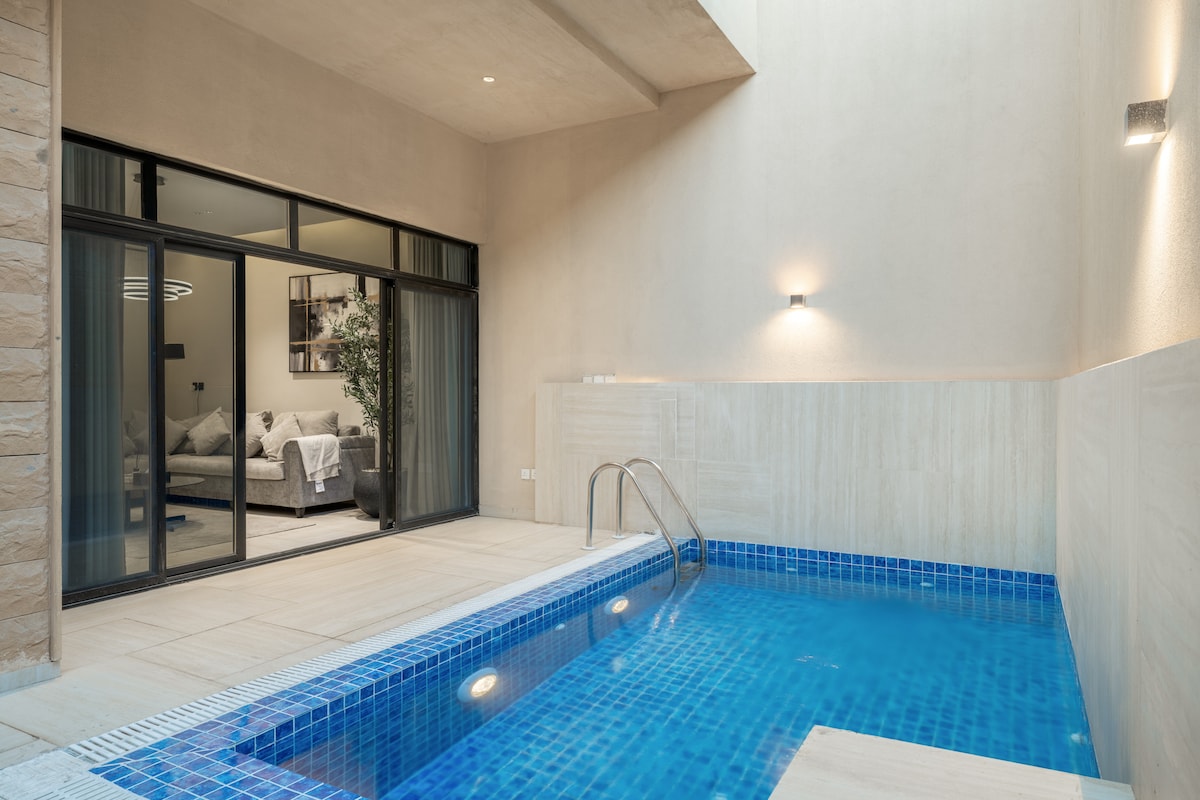 شقة فاخرة في حي حطين بجوار بوليفارد موسم الرياض في مبنى هومتيل ريزدنس بمدخل ذاتي ذكي تتكون من: - مسبح خاص مطل على KAFD و البوليفارد - بلياردو - جلسة خارجية - منطقة معيشة بها شاشة تلفزيون ذكي وصالة طعام ومطبخ وحمام للضيوف - مطبخ متكامل (فرن / ثلاجة / ميكروويف / ماكينة صنع القهوة / غلاية / غسالة ملابس اتوماتيك / أدوات المطبخ) - غرفة ماستر بحمام مستقل - غرفتين نوم تحتوي على سريرين مفرد وبينهم حمام مشترك -ملاحظة : يقع بوليفارد مدينة الرياض على بعد 5 دقائق فقط سيراً على الأقدام.