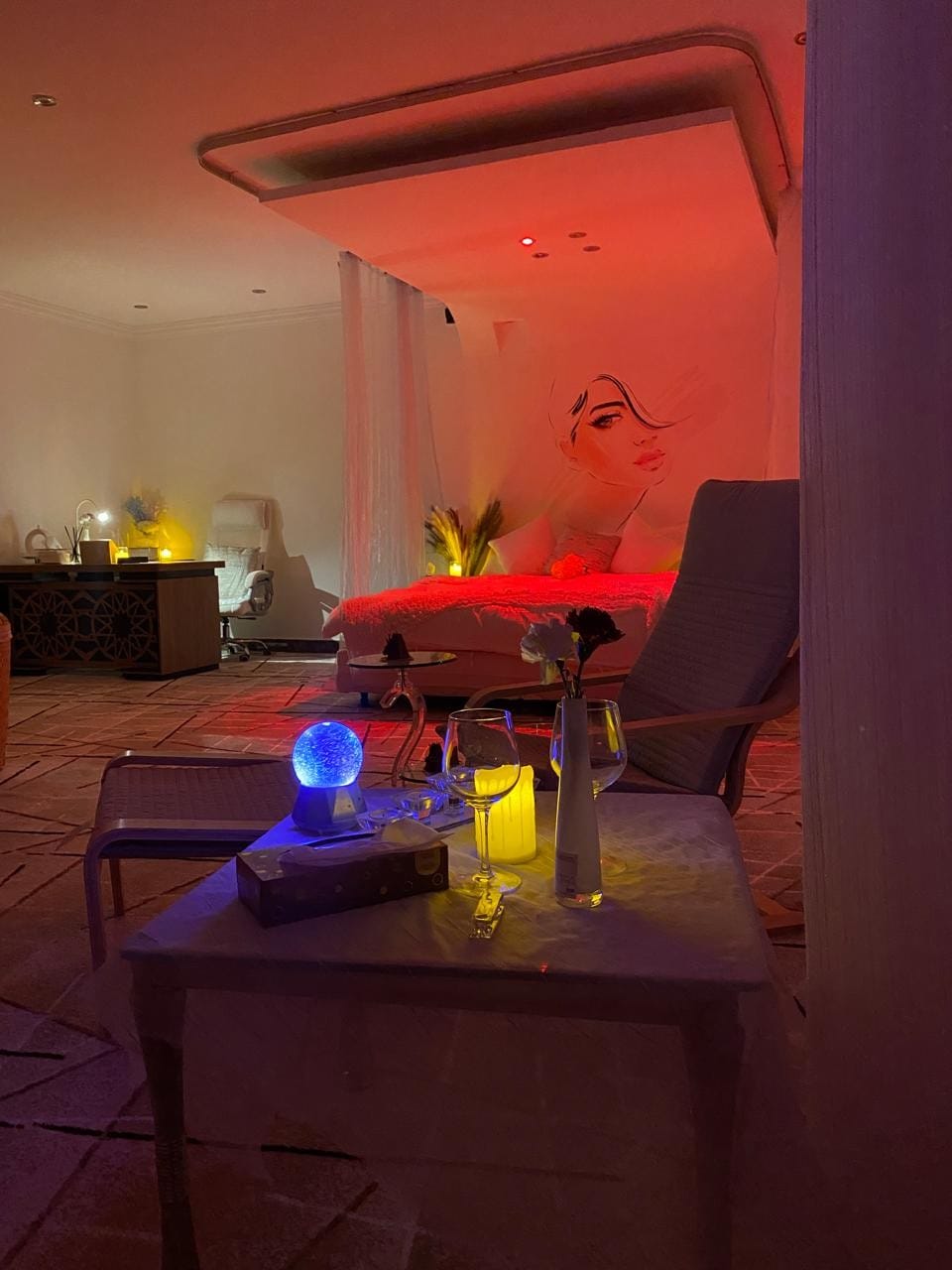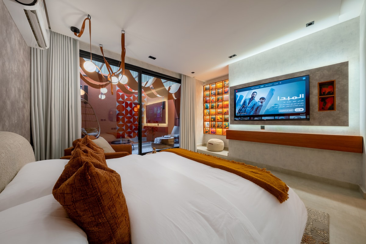 Experience a unique experience in a private Artist Studio offering relaxation and comfort. The studio includes a bed and a side seating area where you can enjoy watching on a 65-inch smart screen. There's also a separate kitchenet and a coffee to serve all your needs and stylish outdoor area with fire pit. location is close to all services, the tourist destination, and Riyadh Season areas (Boulevard,Arena,Etc) within a 5-minute. We would love to host you and share the experience with us!