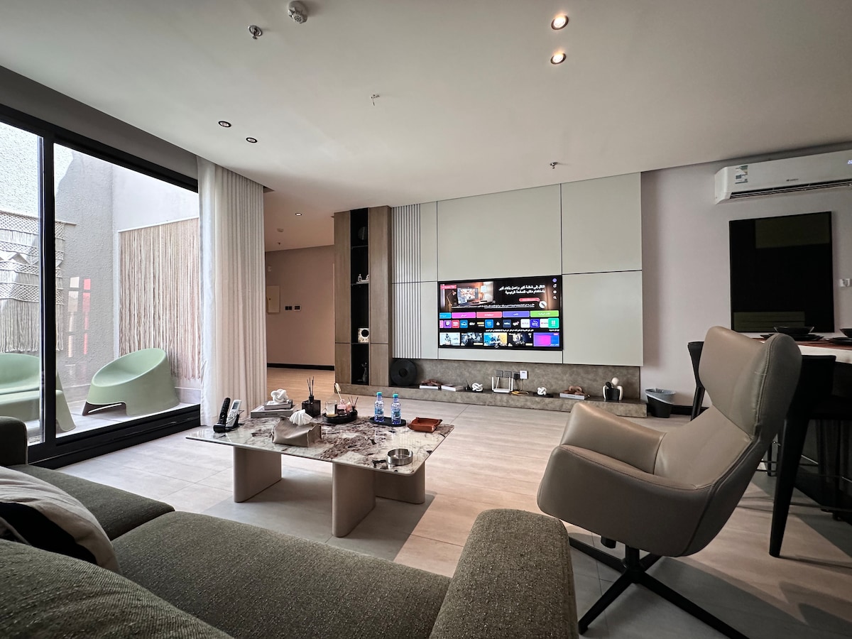 High luxury apartment with: 1- BBQ 2- Outdoor jacuzzi 3- private entrance + self entry 4- waterfall 5- garden 6-projector 7- coffee machine+popcorn maker 8- Kitchen with equipment 9- Hotel Robes, towels and slippers 10- Bose sound sys in all home شقة مودرن عصرية للاستجمام وراحة البال 1- شواية 2- ساوند سيستم كامل بالشقة 3- جاكوزي خارجي 4- مدخل خاص 5- شلال 6- حديقة 7- بروجكتر خارجي 8- قهوة ( بلاك + كبسولات ) + آلةالفشار 9- مطبخ بكامل التجهيزات 10- ارواب و سليبرات فندقية