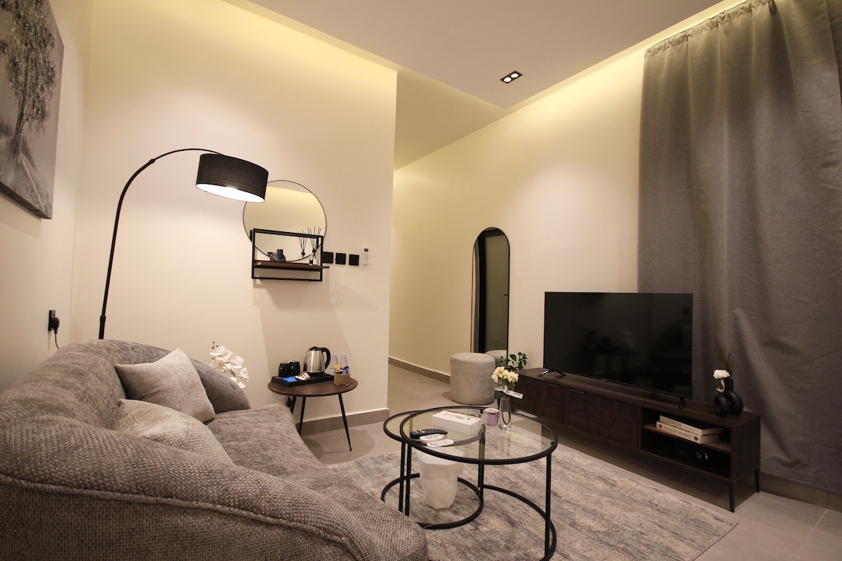 Experience a unique experience in a private 1BR offering relaxation and comfort. The apartment includes a bed and a living area where you can enjoy watching on a 65-inch smart screen. There's also a separate kitchen and a coffee to serve all your needs. location is close to all services, the tourist destination, and Riyadh Season areas (Boulevard City World, Kingdom Dome Arena, and other theaters) within a 5-minute. We would love to host you and share the experience with us!