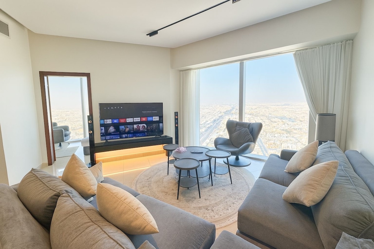 ارتقِ بإقامتك في الرياض في الدور 34، مع إطلالة على طريق الملك فهد. غرفة معيشة أنيقة مع أريكة منحنية، مثالية لمشاهدة المدينة والمهرجانات. تحتوي على غرفة نوم مريحة، حمامين عصريين، ومطبخ مفتوح مع ركن للقهوة. مثالي للاقامة في الرياض! Elevate your Riyadh experience on the 53rd floor with views of King Fahad Road. Enjoy a chic living room with a curved sofa, perfect for city and festival views. Features a cozy bedroom, two modern bathrooms, and an open kitchen with a coffee corner. Ideal for Riyadh!