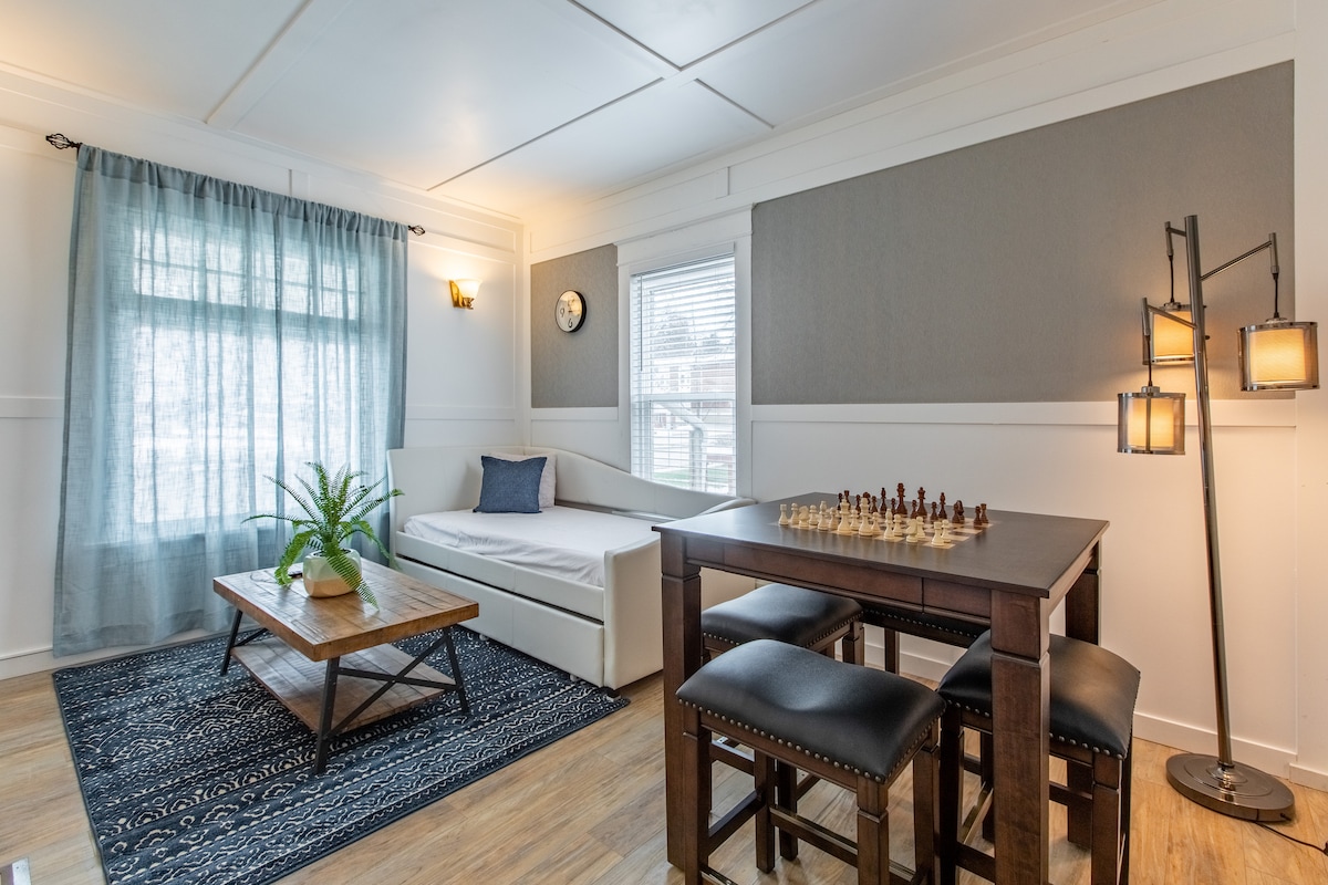 • Enhanced cleaning protocols due to COVID • Fully renovated apartment in summer 2018 • Brand new kitchen in March 2026 • 650 square feet • Upstairs apartment in quiet 4plex • Free off-street parking • 5 blocks north of Mayo Clinic • Walk-in tiled shower • Queen bed • Oversized power recline La-Z-Boy chair • Reclining leather loveseat • 43" Smart TV with DirecTV/cable • High-speed WiFI — 300 MBPS • Shared laundry in the basement • Huge windows for tons of natural light