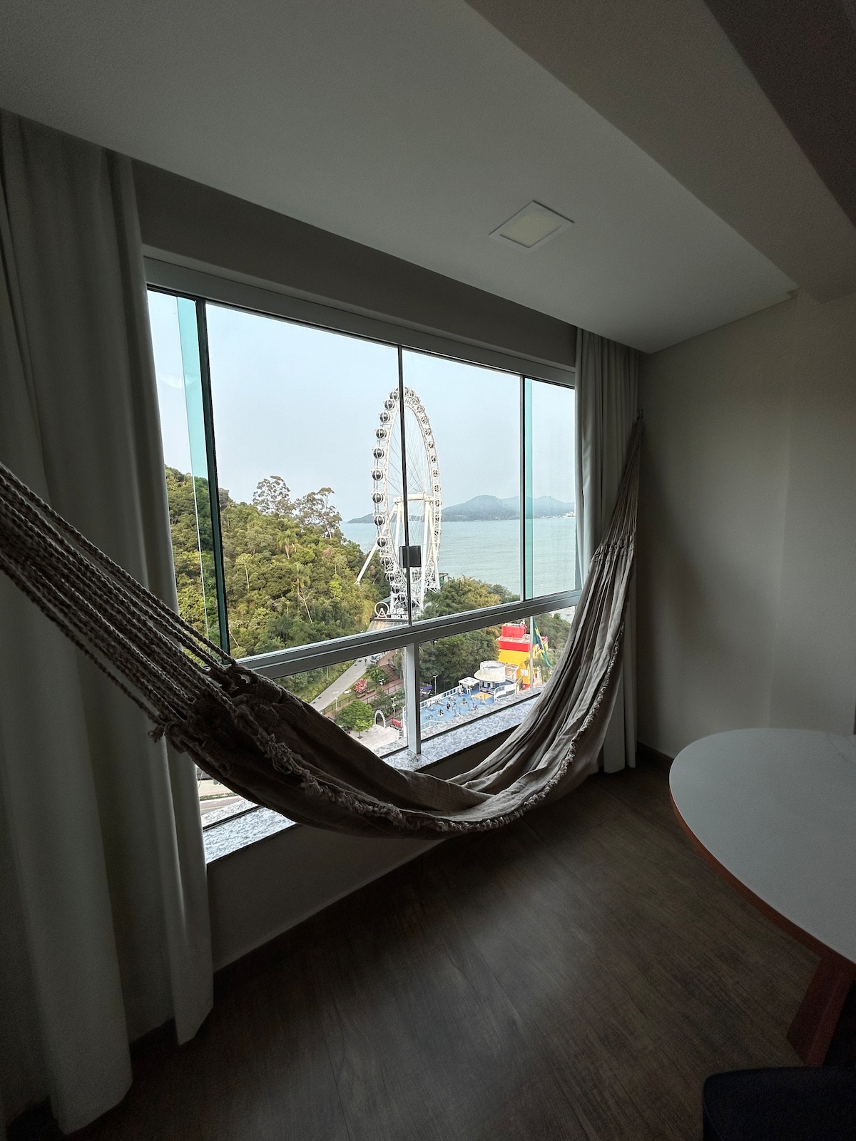Curta uma experiência única neste lugar com localização privilegiada, menos de 50 m da praia na Barra Norte, do outro lado da rua da Roda Gigante. Flat novo, projeto bonito e funcional, com todos os eletrodomésticos e utensílios básicos. Ideal para um casal, com cama box . Para terceiro hóspede, colchão solteiro disponível sob consulta. Prédio c/portaria 24 h, garagem, academia, piscina ( levar atestado) jacuzzi, quiosques c/churrasqueira (pago), lavanderia (paga).