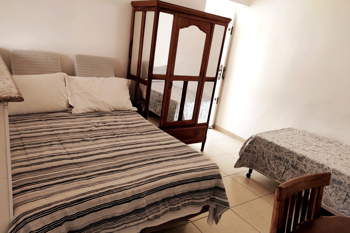 Edícula totalmente independente, tranquila c/wi-fi: - Espaçosa suíte no andar superior c/piso laminado, TV 32" Smart, guarda-roupas, 1 ou 2 camas de solteiro ou 1 de casal, escrivaninha, cadeira e poltrona. - Banheiro exclusivo c/espaçoso box e chuveiro eletrônico c/regulagem de temperatura. - No térreo, cozinha c/pia, purificar água refrigerada Consul, microondas, frigobar, fogão à gás 2 bocas e forno. - Bairro residencial muito tranquilo e muito arborizado. Comércio de conveniência a 1km.
