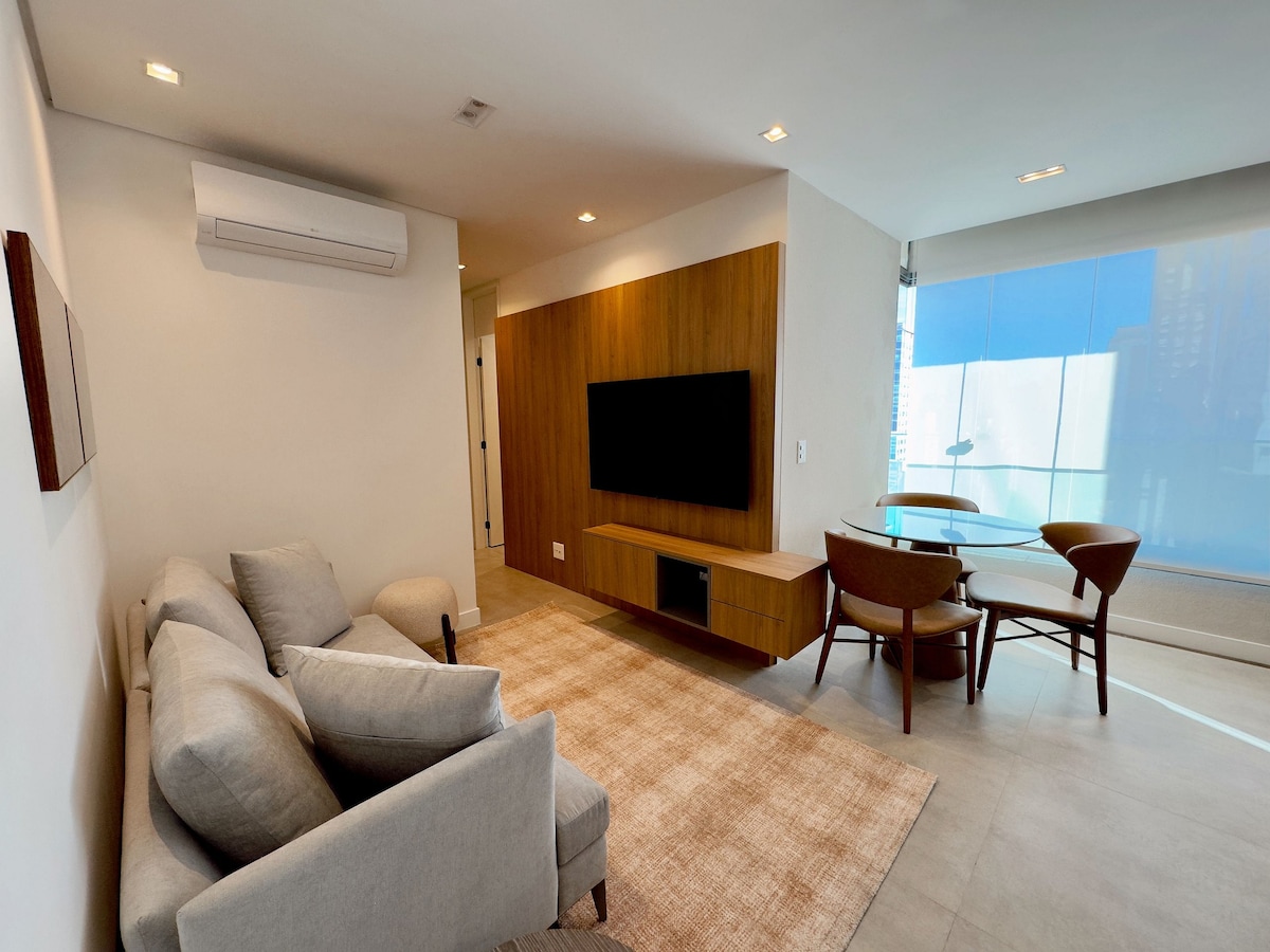 This stylish 50m2 apt. located at Bela Vista, has 24hr doorman. 2 bedrooms (only 1 with AC, and queen bed, the second one is quite small and can be used as an office, fitting a double-sized sofa-bed) and 1 bathroom. With amazing views from every window, it is a great place to work and relax. The private jet tube at the balcony is a fantastic spot to enjoy the city views. Parking - cable/smart tv, fridge with ice maker, oven, wash&dryer, cooktop, microwave, dishwasher and ultra fast internet.