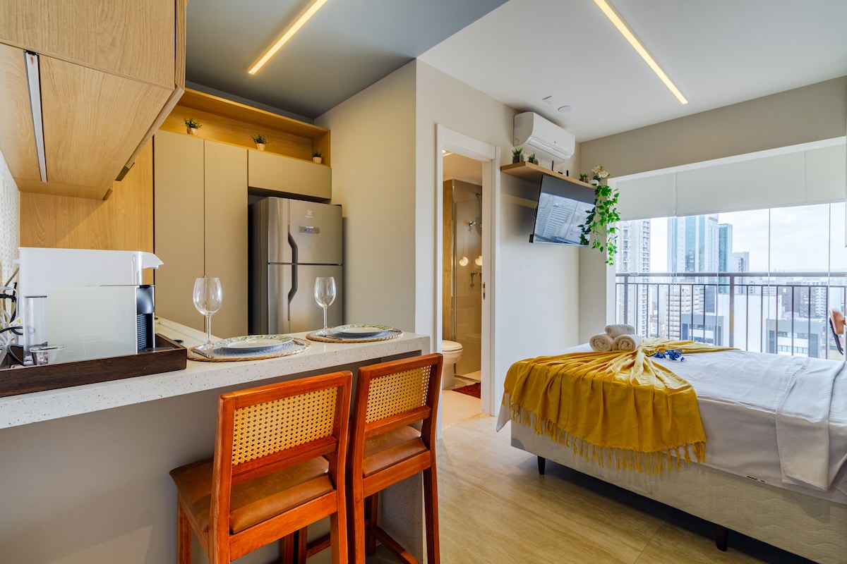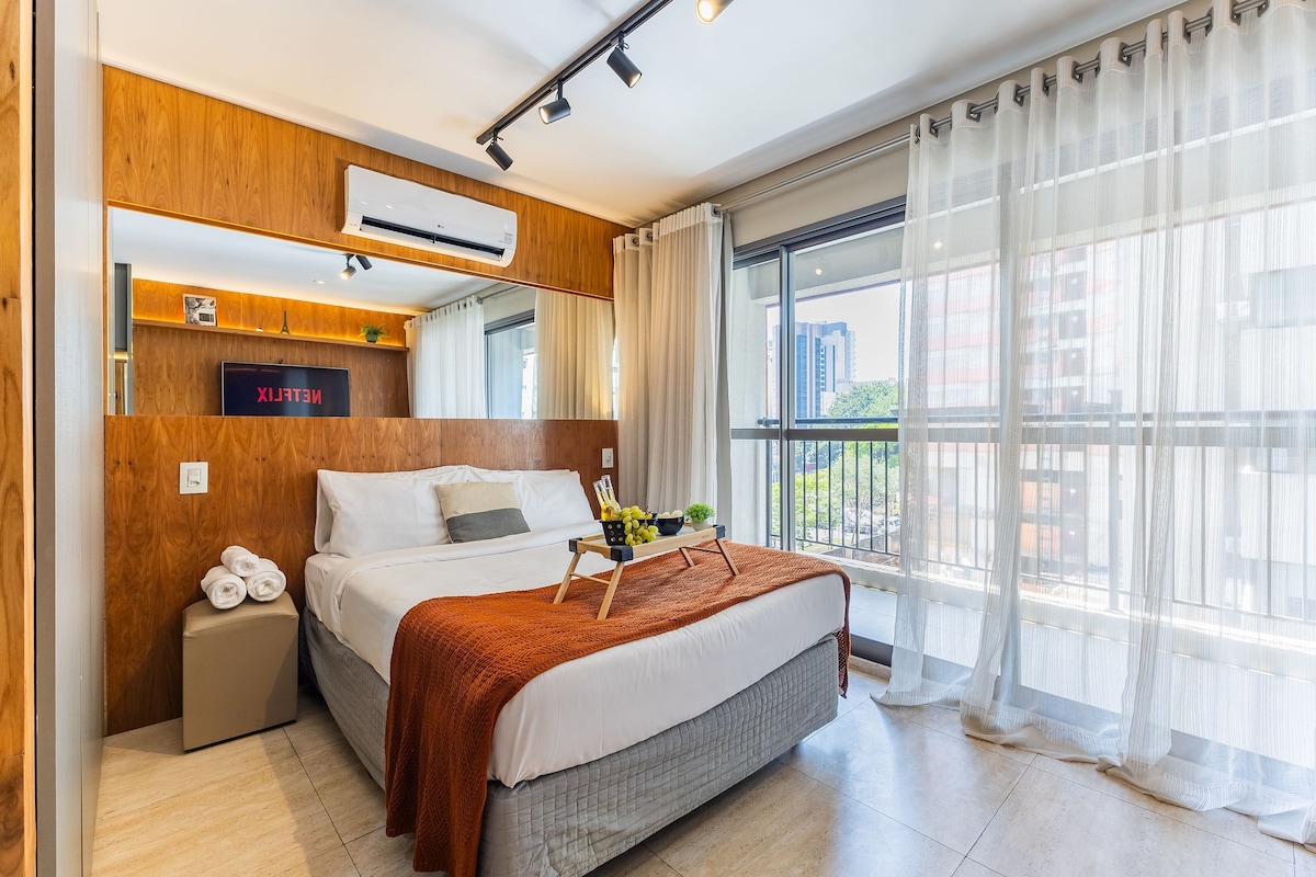 Modern, newly renovated apartment with elegant decor and a cozy atmosphere. The balcony offers an open city view, perfect for relaxing or working with comfort and inspiration. Located in Paraíso neighborhood, one of São Paulo’s most strategic areas, with easy access to Avenida Paulista, hospitals, business centers, and renowned universities. High-standard building with complete amenities: swimming pool, gym, coworking room, and solarium to fully enjoy your stay.