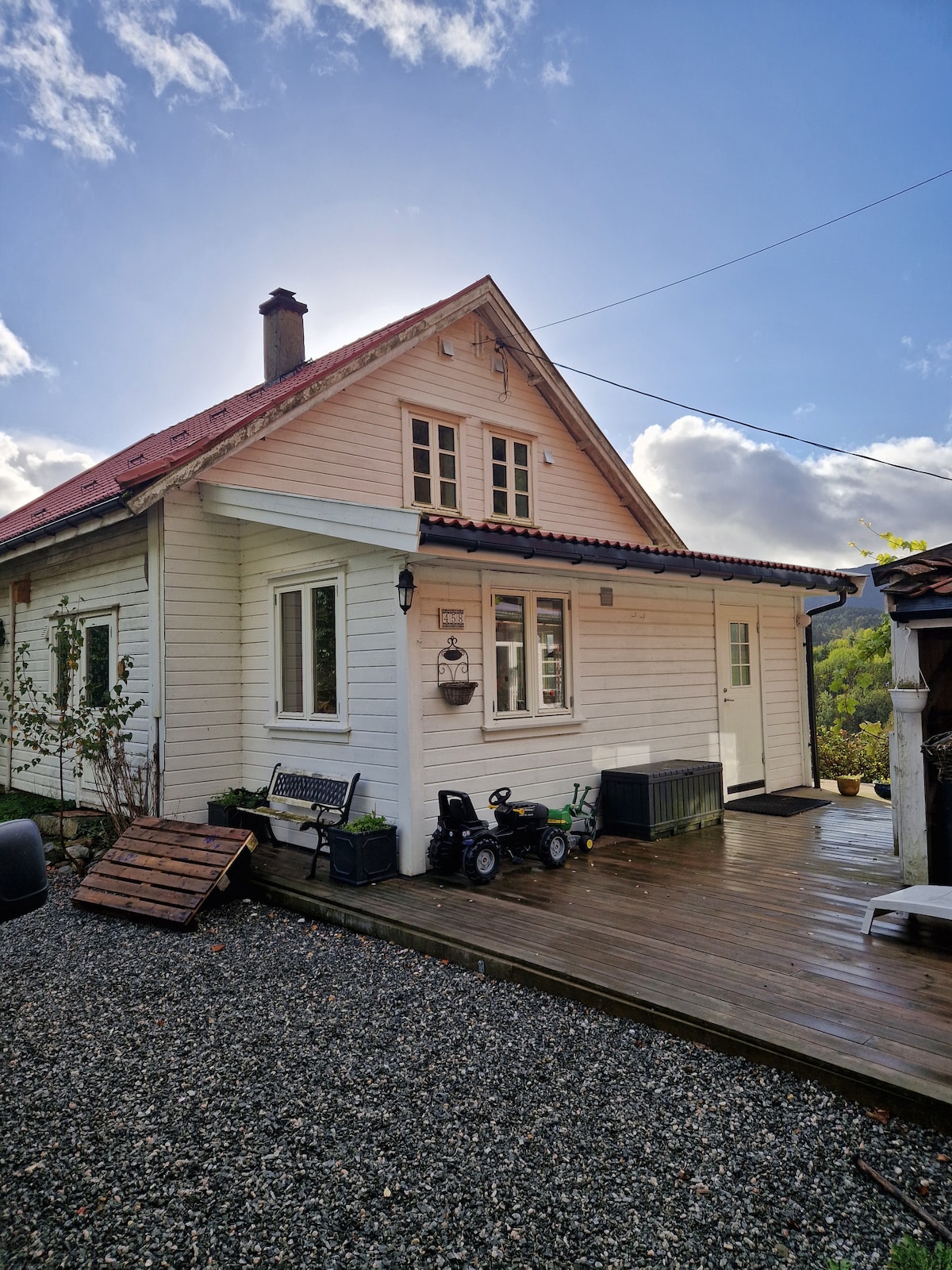 Hytta ligger litt for seg selv i utkanten av et gårdstun, vakkert plassert i skråningen ned mot det idylliske Riskedalsvatnet. Fra spisebordet eller terrassen er det utsikt utover vannet. Hytta er bygget seint på 1980-tallet, men er helt nyoppusset med moderne fargevalg i 2020. Du finner alt du trenger i denne hytta.