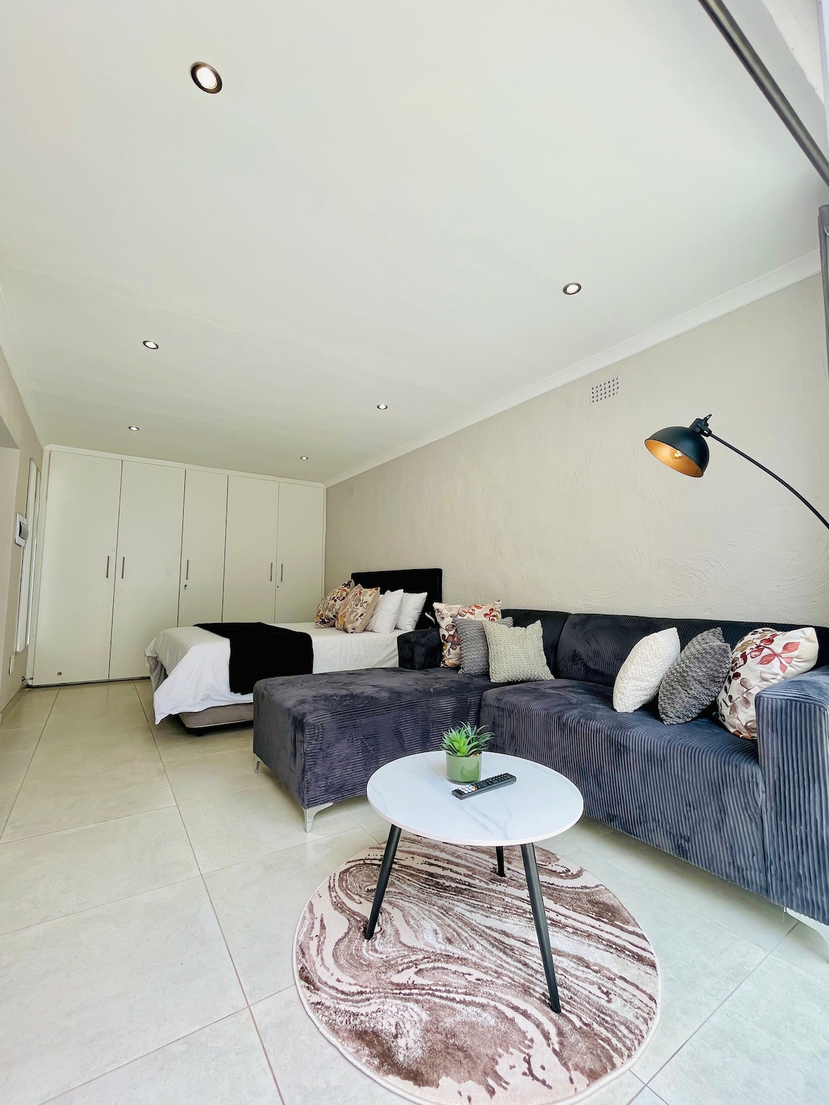 This up market unit is perfect for a home away from home. Lock up and go, secure safe suburb , set in beautiful garden. Easy access to Highways. Comfortable King size bed for great nights sleep. Suitable for short or long term rental, staycation, celebration or business trip. Serviced daily except Sundays and public holidays! Unit comes with one parking bay. Lights, TV and WiFi available during load shedding! Property has a borehole with purified water. Unit has an aircon.