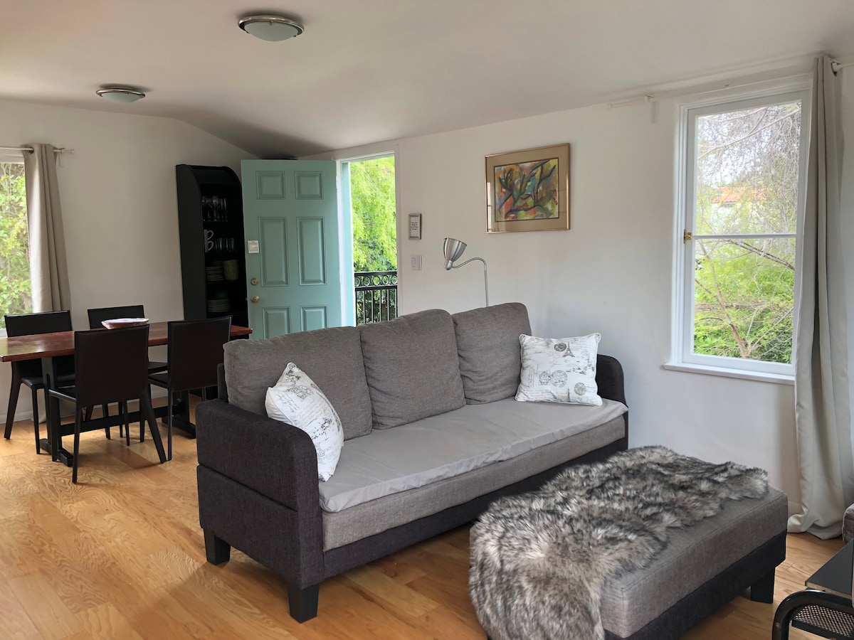 Escape to tranquility in this light-filled, newly remodeled one-bedroom guesthouse apartment on a grand old half-acre Spanish estate. Centrally located in Pasadena with easy freeway access, enter another world as you step under the estate's redwood, palm, and magnolia trees. Take the stairs to the apartment under a hundred-year-old olive tree. Enjoy the view from the sundeck, and dream away some hours on a hammock in the bamboo grove next to a fish pond, while listening to birds sing.