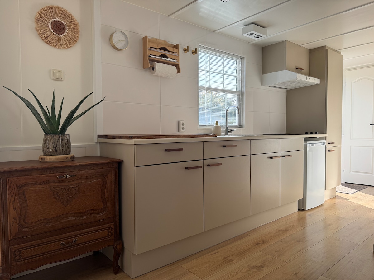 A lovely, modern guesthouse in a recently renovated summerhouse on farmhouse Welgelegen. The lodge has a private entrance and private terras with an amazing look out. It has it's own kitchen with fridge, dishwasher and oven/microwave. The stairs bring you to the upper floor where you find a kingsize double bed and a walk in shower. The sofa in the living room is suitable for 2 persons. The lodge is situated next to a beautiful river and within a 15 minute walk you can catch a train to Amsterdam.