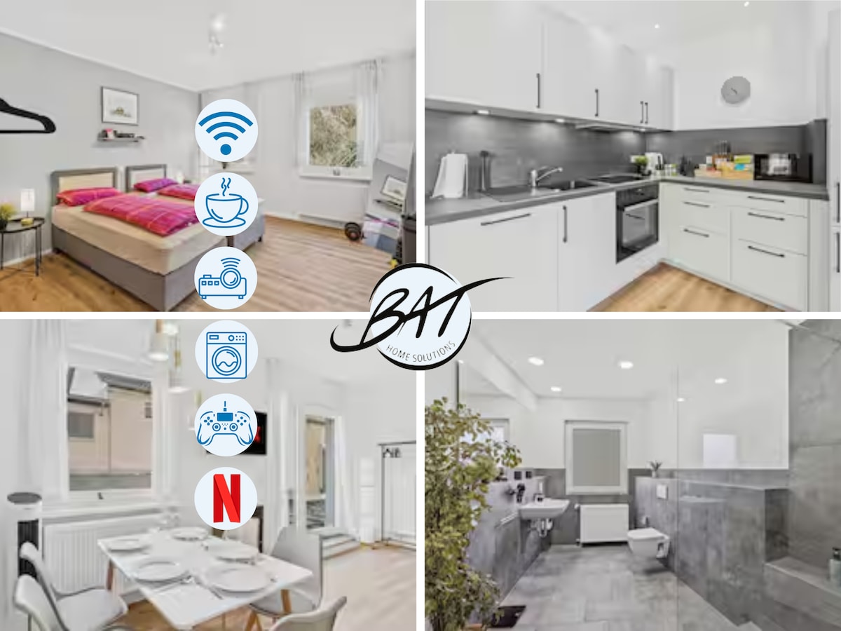 Stufenfreie Wohnung im Erdgeschoss, schön, hell, gemütlich und freundlich eingerichtete Wohnung mit Komfort und Komplettausstattung. 4 DTV 🌟Sterne, Neubau, auch kühl in heißen Sommertagen, bevorzugte Wohngehend in Saarlouis, 75qm, Radunterbringung/Home Office ,Terrasse mit schönem Blick in den Garten. entspannter sehr ruhiger Schlaf, großzügiger Wohnraum mit offener Küche. Separater Tisch mit Stühlen, modernes Bad mit Fenster. Sie ist sehr citynah, 800m bis Zentrum. Hauptbahnhof in der Nähe.