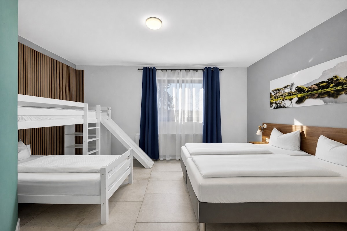 Добро пожаловать в нашу дизайнерскую маизонетту, сертифицированную по стандарту DTV 4**** в Саарланде! Квартира площадью 115 м² расположена в тихом и центральном районе Хайлигенвальда. В ней 2 спальни: одна с двуспальной кроватью (180×200) и роллставнями; вторая — в формате открытой студии с кроватью boxspring, диваном-кроватью, зоной отдыха с эл.камином и рабочим местом. Гостиная с диваном-кроватью и балконом, оборудованная кухня, ванная с душем и биде, частная терраса с павильоном и грилем.
